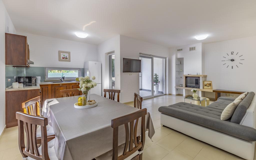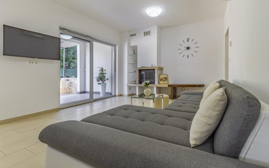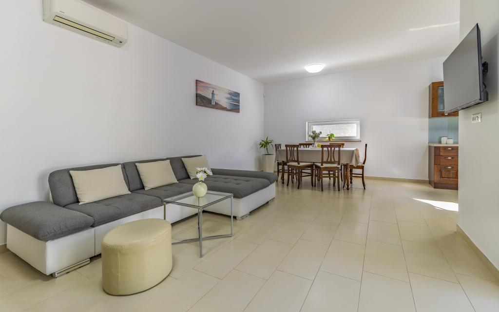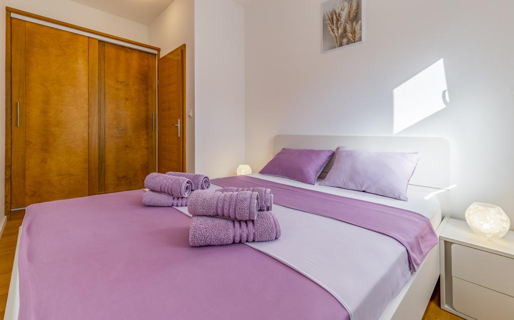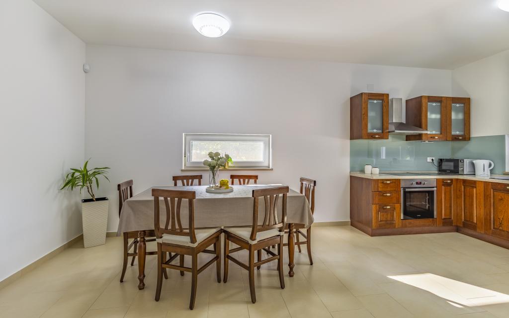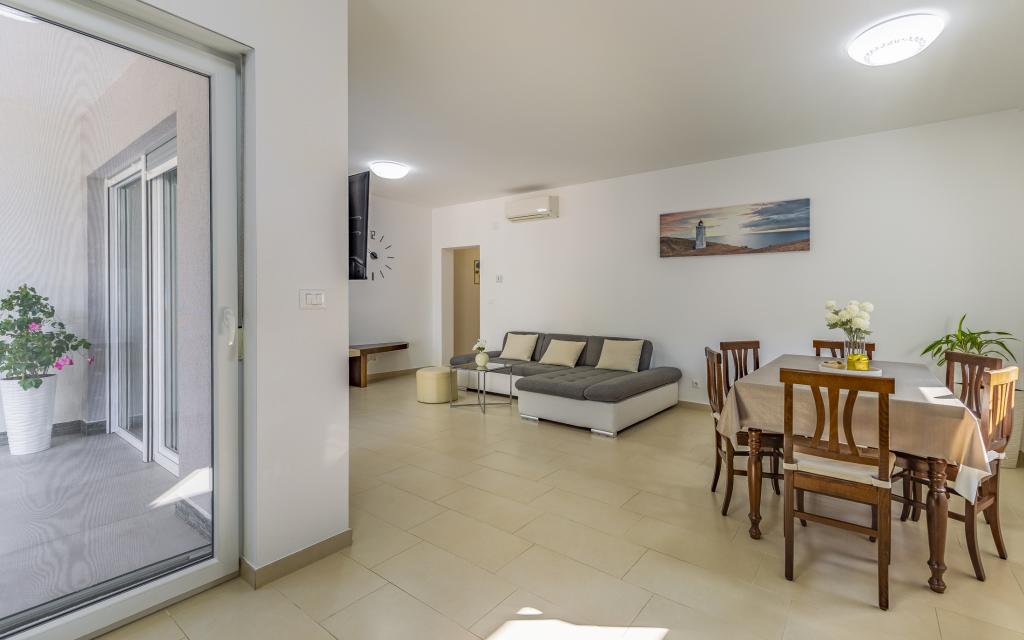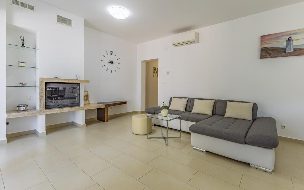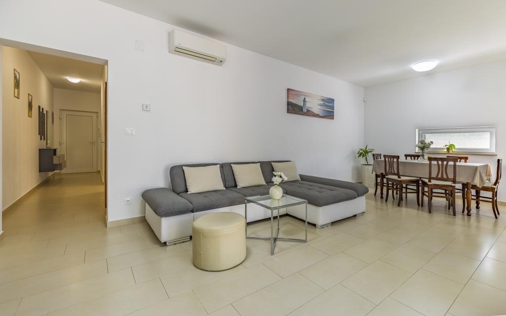 Volledig en bovengemiddeld gemeubileerd appartement (80 m²) op een uitstekende locatie in een rustig deel van Banjol, op slechts 5 minuten (300 m) lopen van de mooiste stranden in de omgeving. Het appartement bevindt zich op de begane grond van een woongebouw met slechts drie appartementen. Het appartement beschikt over een eigen tuin (100 m²) met een terras, tafel, ligstoelen, buitendouche en barbecue, wat zorgt voor aangenaam sociaal contact met veel privacy en is met name geschikt voor gezinnen met kinderen. Er is een privéparkeerplaats naast het gebouw met directe toegang tot de tuin en het terras. De tuin is in 2024 volledig gerenoveerd. Het gehele gebouw is beveiligd met een veiligheidshek (toegang met kaart). Het appartement beschikt over 2 slaapkamers met een tweepersoonsbed, 2 badkamers met toilet en douche, een ruime woonkamer met een uitschuifbare bank, een eetkamer en een keuken. Het appartement is voorzien van airconditioning en verwarming in de winter (vloerverwarming) en heeft een binnenhaard, waardoor het ook geschikt is voor een verblijf in de koudere herfst- en wintermaanden. In de directe omgeving van het appartement bevinden zich talrijke bars en restaurants, alsook gezellige winkels.