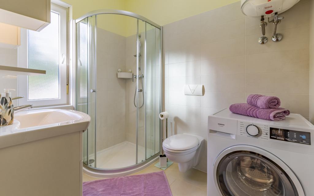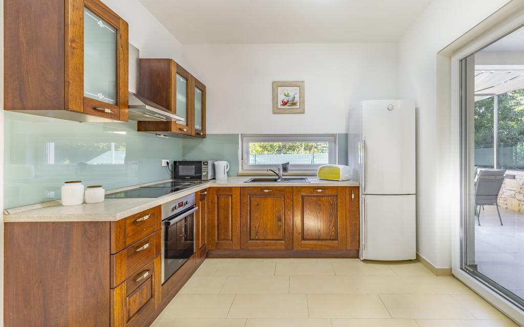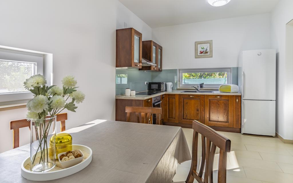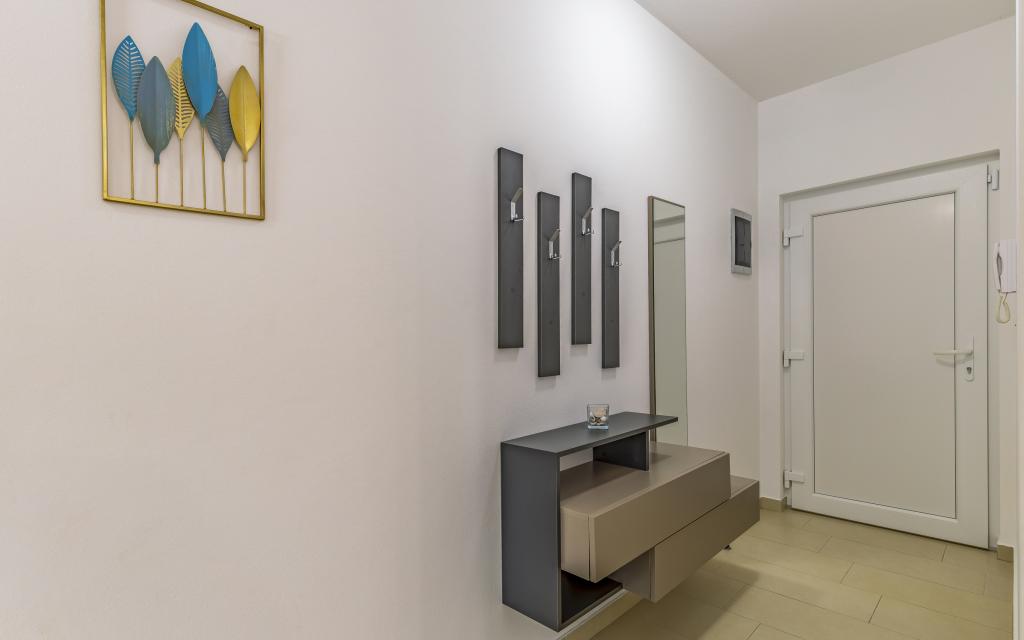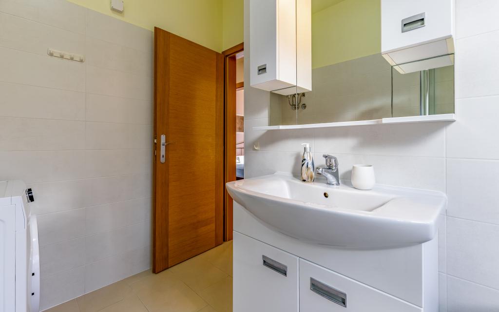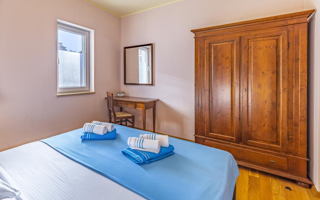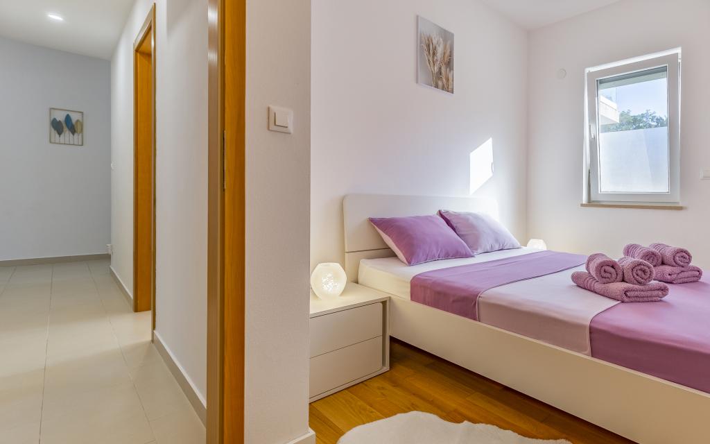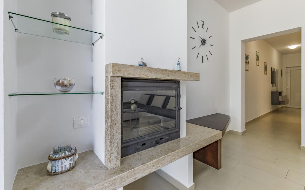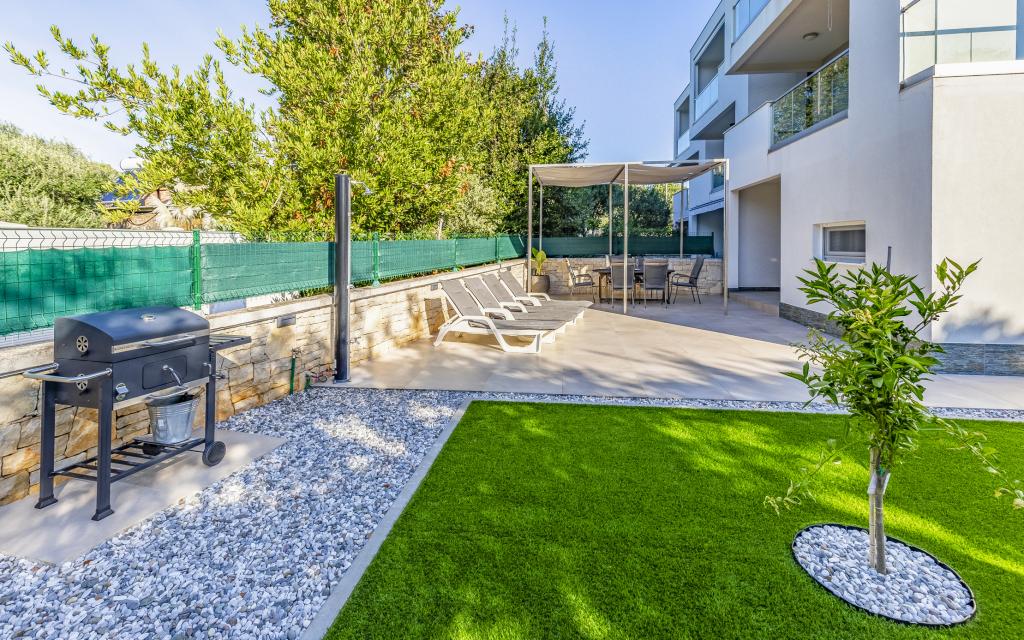 Volledig en bovengemiddeld gemeubileerd appartement (80 m²) op een uitstekende locatie in een rustig deel van Banjol, op slechts 5 minuten (300 m) lopen van de mooiste stranden in de omgeving. Het appartement bevindt zich op de begane grond van een woongebouw met slechts drie appartementen. Het appartement beschikt over een eigen tuin (100 m²) met een terras, tafel, ligstoelen, buitendouche en barbecue, wat zorgt voor aangenaam sociaal contact met veel privacy en is met name geschikt voor gezinnen met kinderen. Er is een privéparkeerplaats naast het gebouw met directe toegang tot de tuin en het terras. De tuin is in 2024 volledig gerenoveerd. Het gehele gebouw is beveiligd met een veiligheidshek (toegang met kaart). Het appartement beschikt over 2 slaapkamers met een tweepersoonsbed, 2 badkamers met toilet en douche, een ruime woonkamer met een uitschuifbare bank, een eetkamer en een keuken. Het appartement is voorzien van airconditioning en verwarming in de winter (vloerverwarming) en heeft een binnenhaard, waardoor het ook geschikt is voor een verblijf in de koudere herfst- en wintermaanden. In de directe omgeving van het appartement bevinden zich talrijke bars en restaurants, alsook gezellige winkels.