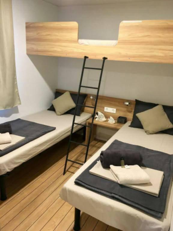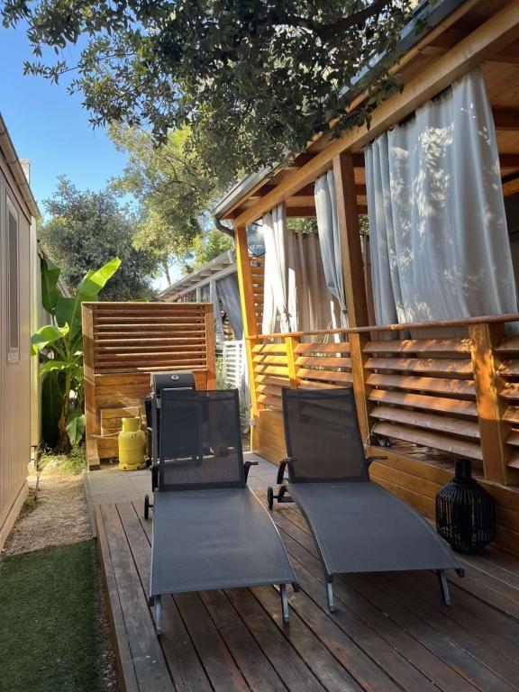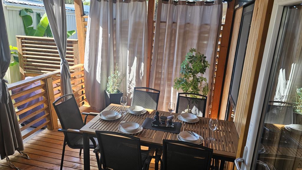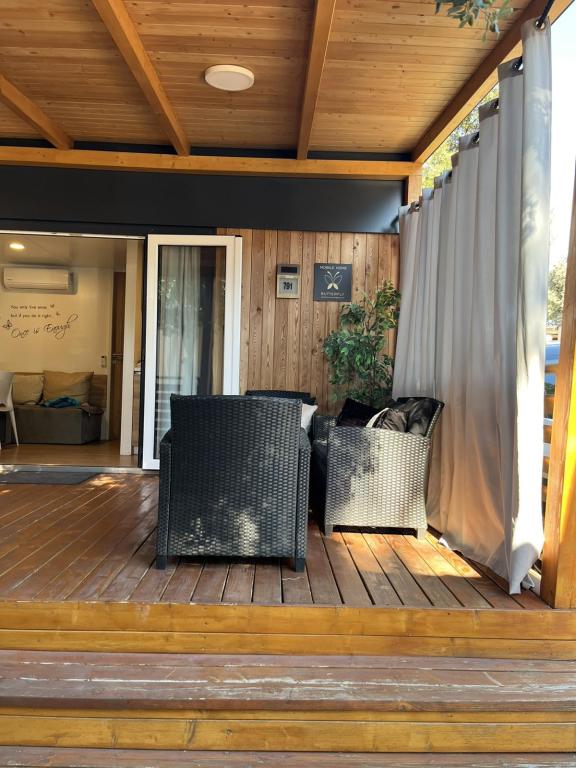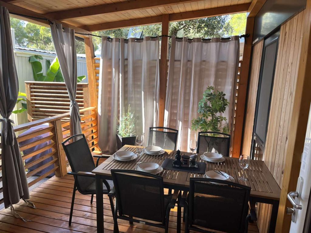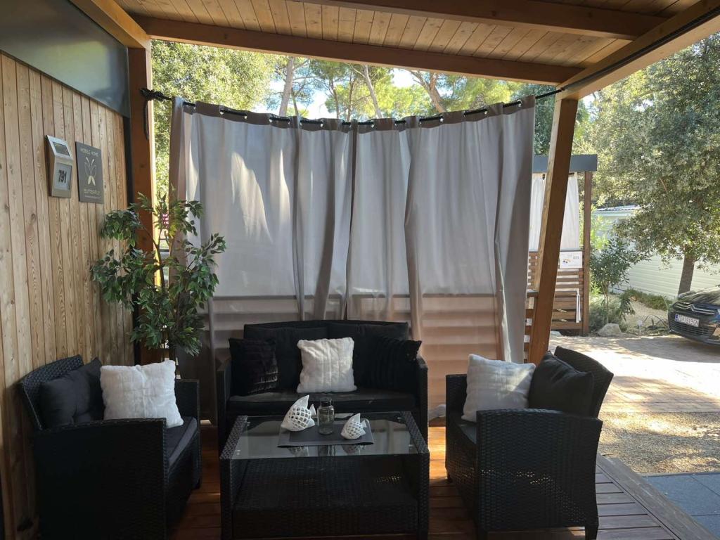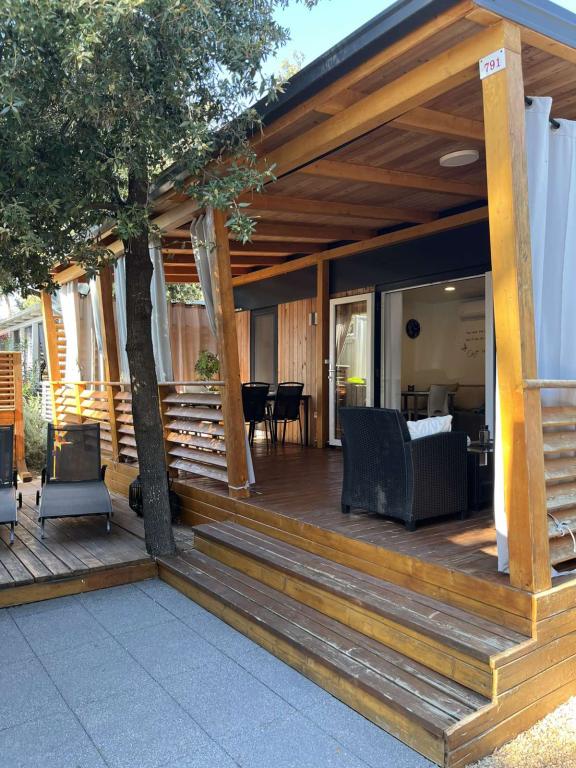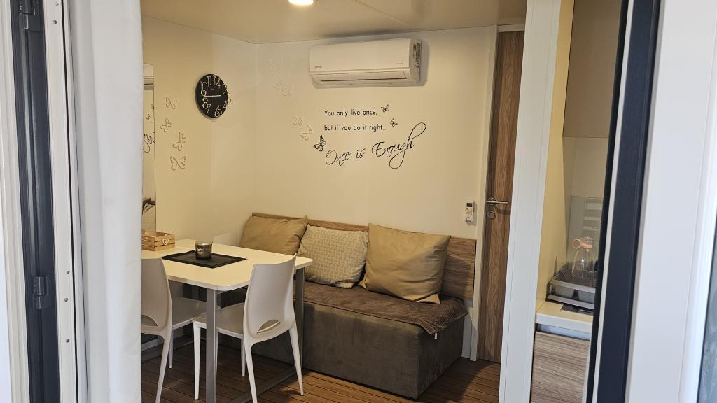 Moderne, van airconditioning voorziene stacaravan op camping Park Soline, op slechts een steenworp afstand van het strand en op 15 minuten lopen van het centrum van Biograd. De stacaravan beschikt over 2 slaapkamers, een keuken, een woonkamer, 2 badkamers en een overdekt terras met tuinmeubilair. Gratis wifi, parkeergelegenheid, kinderanimatie, sportvelden en een mediterraans restaurant zijn aanwezig op de camping. Perfect voor gezinnen of stellen die op zoek zijn naar ontspanning in de schaduw van de pijnbomen, dicht bij alle belangrijke bezienswaardigheden.