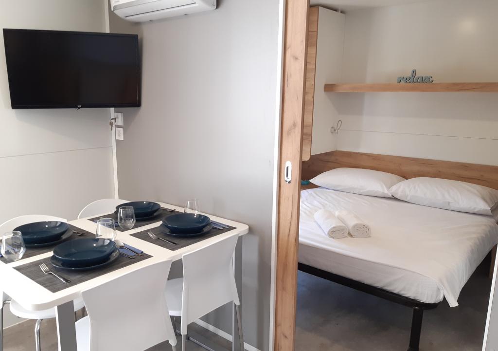 De moderne stacaravan InnMare 781, gelegen in een rustig deel van camping Soline, midden in een dennenbos, is de perfecte plek voor een familievakantie. Met een oppervlakte van 32 m² bestaat de stacaravan uit een slaapkamer met een tweepersoonsbed, een slaapkamer met twee eenpersoonsbedden, een woonkamer met een slaapbank (voor 1-2 personen), een badkamer met toilet, een terras van 32 m², een kleine tuin en een parkeerplaats. De woning is volledig gemeubileerd en de keuken is, naast de standaarduitrusting, voorzien van een magnetron, een waterkoker en een espressomachine. Op het terras staat een eettafel, ligstoelen om heerlijk te ontspannen in de geur van dennenbomen, en naast de stacaravan bevindt zich een elektrische grill, die eveneens tot de uitrusting behoort en door gasten gebruikt kan worden. Naast de stacaravan is er ook een parkeerplaats voor één auto beschikbaar. Welkom bij InnMare 781, een modern pand ontworpen voor een rustige en idyllische familievakantie in een vredig dennenbos, op korte afstand van de zee, de stranden en Biograd na Moru!