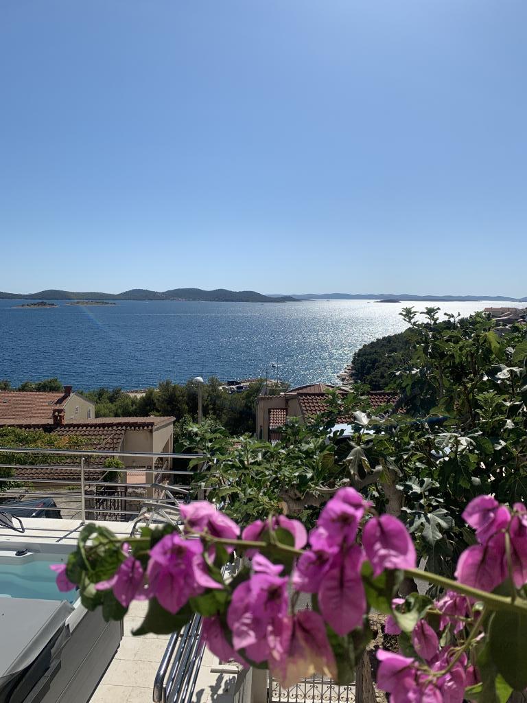 Appartement met een prachtig uitzicht op de zee en de Kornati-eilanden. Achter het appartement is er een terras met aangelegde tuin en een gemeenschappelijke barbecue. Het is 3 minuten lopen naar het strand. Langs de kust ligt een dicht dennenbos met een steen- en kiezelstrand (voor kinderen). Naast het strand is er ook een strandbar en een restaurant-pizzeria en bakkerij. De winkel ligt op slechts 300 meter afstand, 5 minuten lopen. Het natuurpark Vrana Lake ligt op 1500 meter afstand.