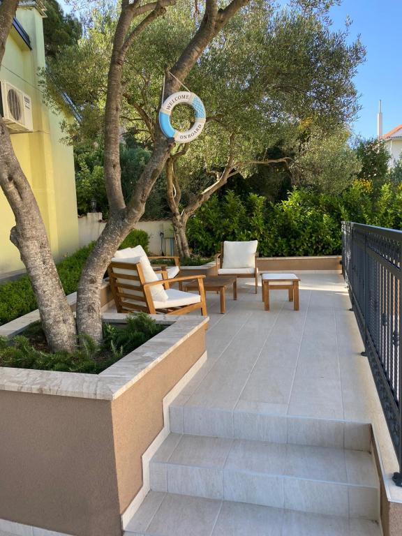 Nieuwe, volledig uitgeruste appartementen met zeezicht, zwembad, satelliet-tv, airconditioning, keuken, toilet en douche, op 2-3 minuten loopafstand van de zee. De accommodatie is gelegen in een prachtige olijfgaard van circa 2500 m², met veel bloemen en groen. Nieuw gebouwd zwembad van 32 m² met een zwemgedeelte van 200 m² en uitzicht op zee. Barbecue beschikbaar voor gedeeld gebruik. Appartement nummer 1 bestaat uit: 3 kamers (waarvan 2 slaapkamers), 55 m², 4+2 personen. Entree op de begane grond, via het terras naar de woonkamer. Begane grond: slaapkamer 1 met tweepersoonsbed, woonkamer met keuken en zithoek, slaapkamer 2 met tweepersoonsbed en slaapbank, toilet/douche, terras. Appartementen 2 en 3 bestaan uit 2 kamers, waarvan 1 slaapkamer, woonkamer met keuken en zithoek, toilet/douche, balkon. Relax House bestaat uit 3 kamers, waaronder 2 slaapkamers, in de woonkamer bevindt zich een keuken en een slaapbank, toilet/douche, terras. Het vakantiehuis bestaat uit 3 kamers, waaronder 2 slaapkamers, een woonkamer met toilet en douche, en een terras.