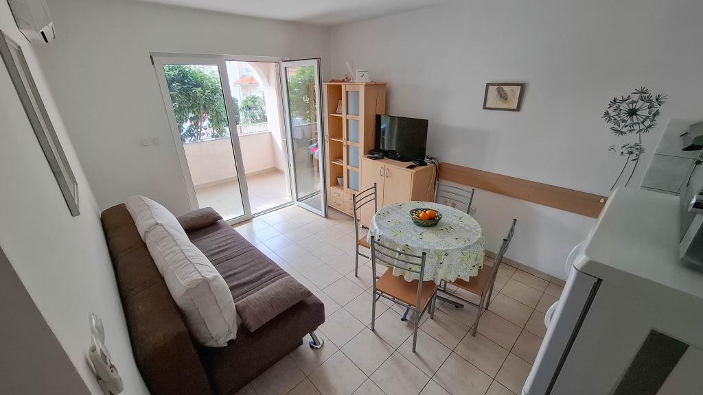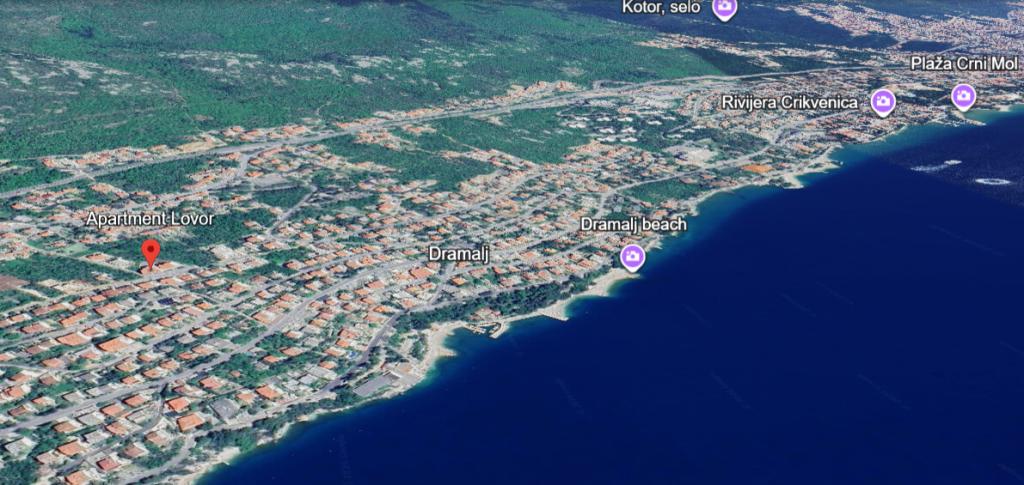 Appartement Lovor (31m²), begane grond van woongebouw, rustig gelegen in Dramalj. 450m van zee, nabij Thalassotherapia, Adrenaline Park en paden. Ideaal voor 2-3 volwassenen of gezin. Bevat slaapkamer (160x200), badkamer, terras en uitgeruste keuken (koelkast, fornuis, magnetron, waterkoker, koffiezetter, broodrooster, keukengerei) met woonkamer (TV, slaapbank 75x200/150x200). Airco, gratis Wi-Fi en privéparkeerplaats.