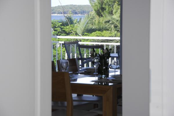 3 volledig nieuw gebouwde en moderne appartementen bevinden zich in de eerste rij naar de zee, gelegen in een rustige omgeving van Fažana, in het groen, met een idyllisch uitzicht over de zee en de Brijuni-eilanden. Ze bevinden zich op slechts 50 meter van het strand. Aan de voorzijde is een loopbrug, en gazon en dan het strand. Parkeren is in de voorkant van het huis. De auto wordt alleen gebruikt voor reizen, omdat het in de directe omgeving. De appartementen zijn bijzonder geschikt voor gezinnen met kinderen, omdat het in de buurt van de speeltuin (60m) en vanwege de afstand van uitvalswegen. In de directe omgeving zijn er sportfaciliteiten; beach volleybal, zeilen, windsurfen, fietspaden ... Alle drie suites hebben grote terrassen (20 m2) met uitzicht op zee.