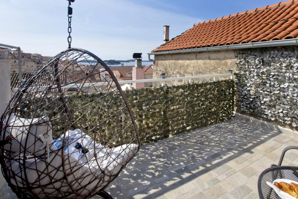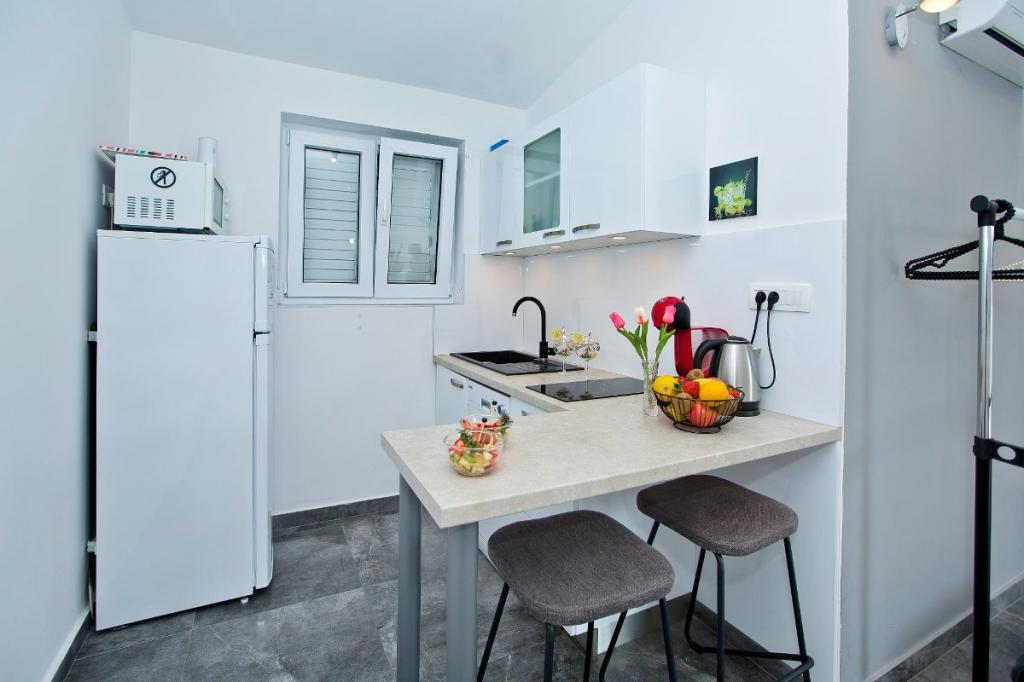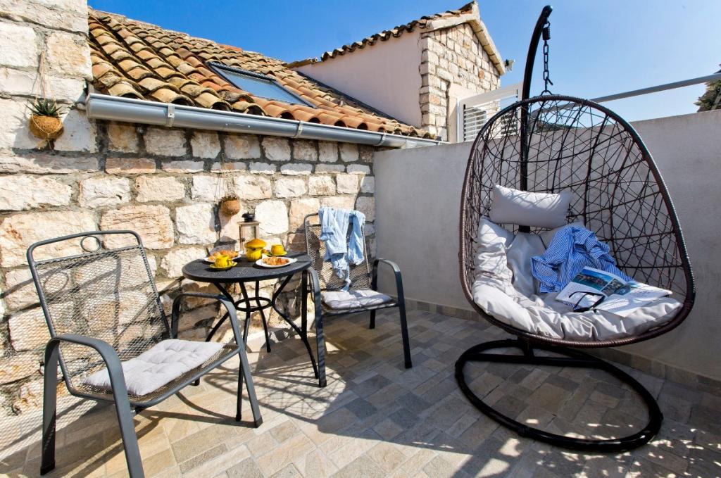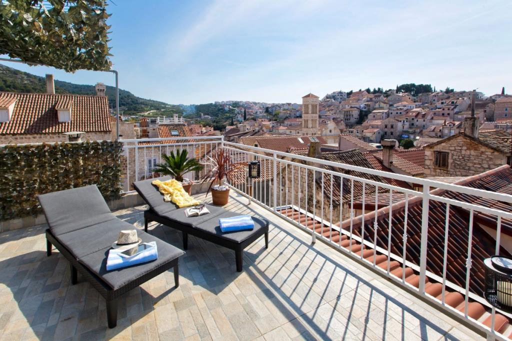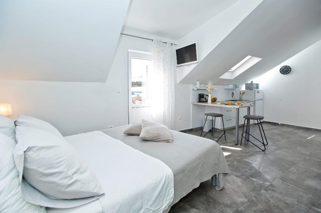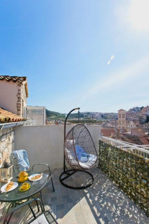 Elegant ingerichte studio-appartementen, gelegen in het hart van Hvar, bieden de perfecte combinatie van comfort en een uitstekende locatie. De appartementen zijn licht en modern, voorzien van een comfortabel tweepersoonsbed (160 x 200 cm), een volledig uitgeruste keuken met alle benodigde voorzieningen (koelkast met vriezer, waterkoker, broodrooster, kookplaten, magnetron, vaatwasser), een badkamer met inloopdouche, airconditioning en beide een eigen terras (buitentafel, stoelen en ligstoelen) met een betoverend uitzicht op de oude stad en de prachtige haven van Hvar. Beleef het beste van Hvar letterlijk voor de deur: charmante cafés, toprestaurants, gezellige ontbijttentjes, lokale boetiekjes en souvenirwinkels. Het centrale stadsplein met de Sint-Stephansdom en het oudste openbare theater van Europa liggen op slechts 3 minuten lopen. U verblijft in het hart van Hvar, maar toch in een perfect rustige straat die garant staat voor een vredige en aangename nachtrust.