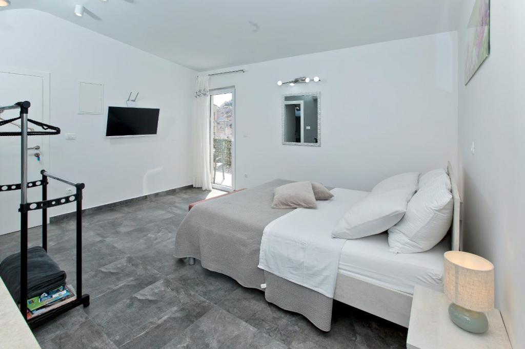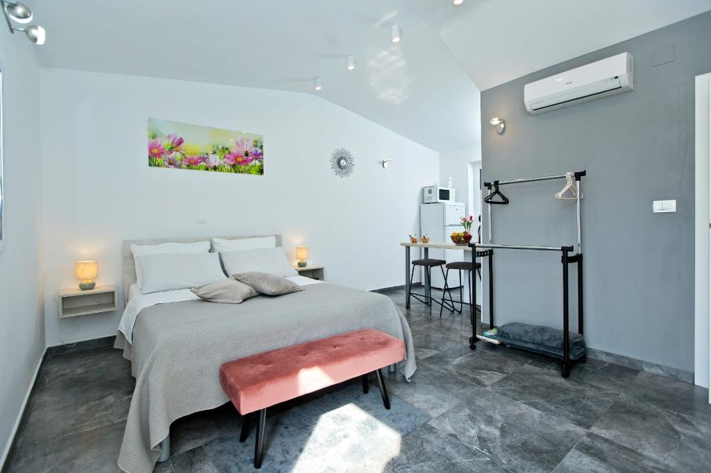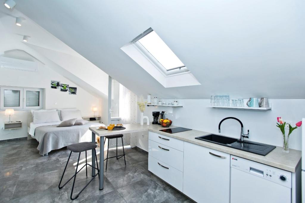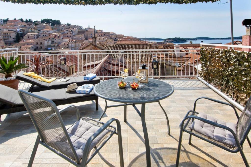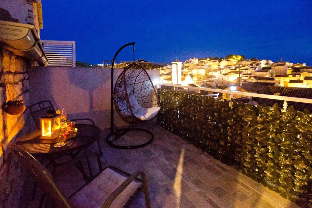 Elegant ingerichte studio-appartementen, gelegen in het hart van Hvar, bieden de perfecte combinatie van comfort en een uitstekende locatie. De appartementen zijn licht en modern, voorzien van een comfortabel tweepersoonsbed (160 x 200 cm), een volledig uitgeruste keuken met alle benodigde voorzieningen (koelkast met vriezer, waterkoker, broodrooster, kookplaten, magnetron, vaatwasser), een badkamer met inloopdouche, airconditioning en beide een eigen terras (buitentafel, stoelen en ligstoelen) met een betoverend uitzicht op de oude stad en de prachtige haven van Hvar. Beleef het beste van Hvar letterlijk voor de deur: charmante cafés, toprestaurants, gezellige ontbijttentjes, lokale boetiekjes en souvenirwinkels. Het centrale stadsplein met de Sint-Stephansdom en het oudste openbare theater van Europa liggen op slechts 3 minuten lopen. U verblijft in het hart van Hvar, maar toch in een perfect rustige straat die garant staat voor een vredige en aangename nachtrust.