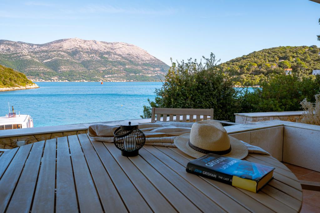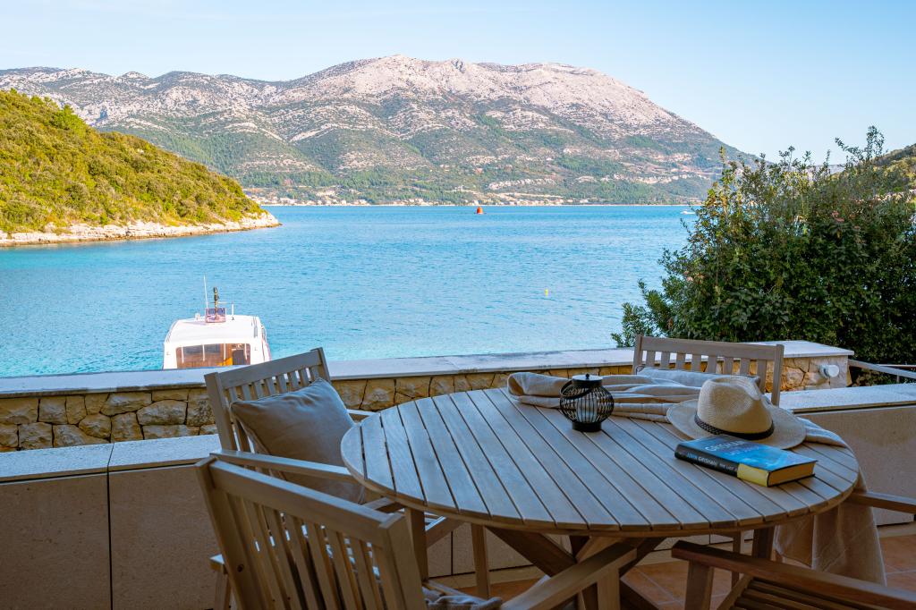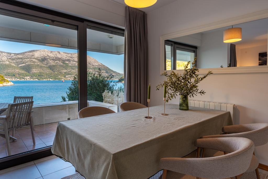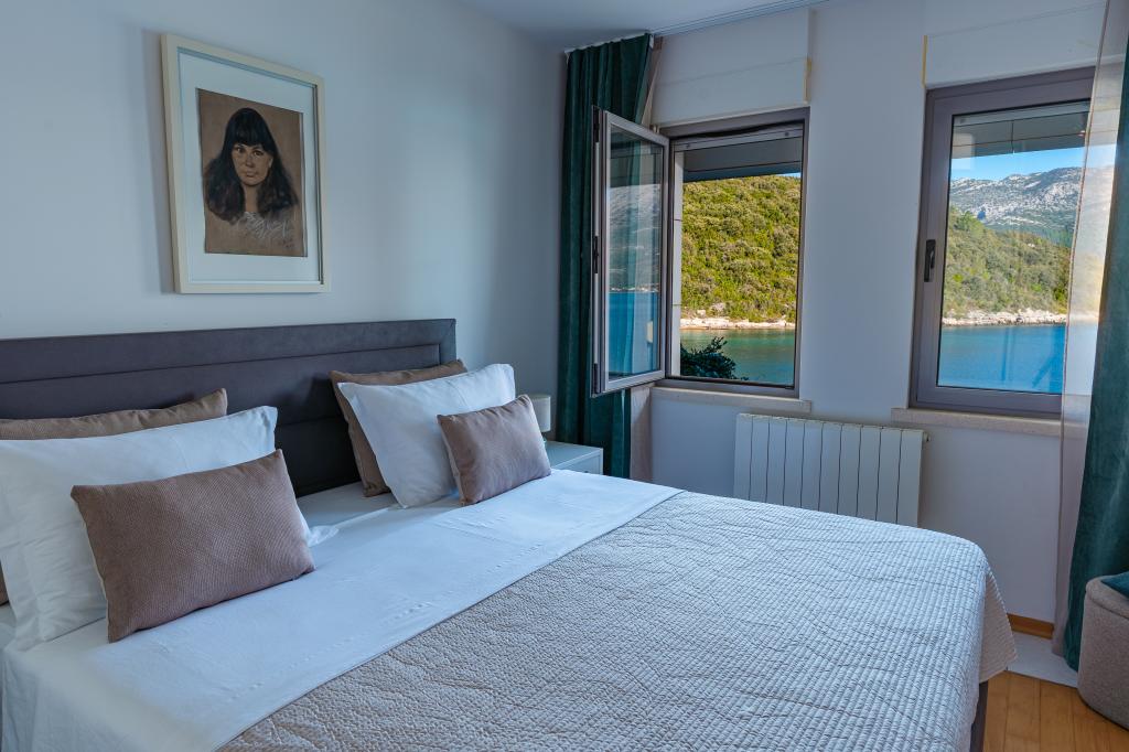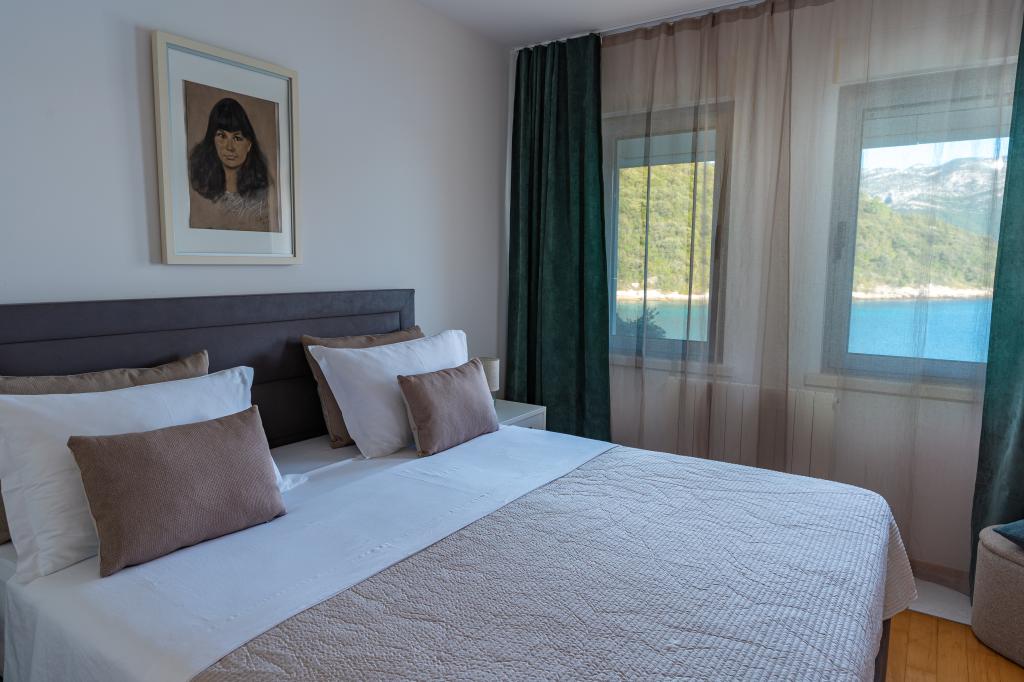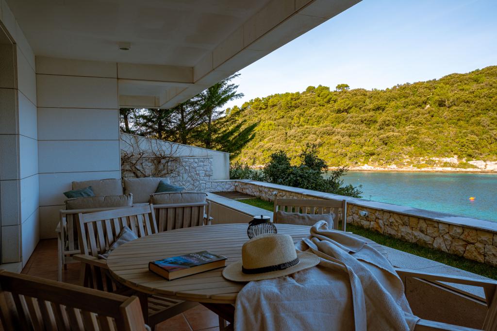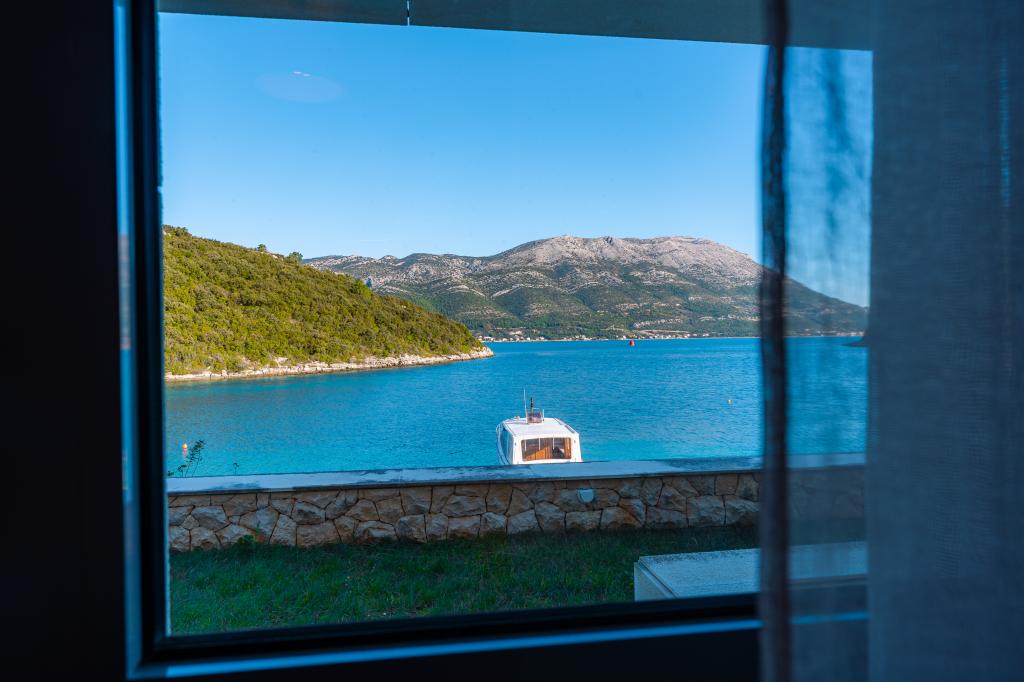 Villa Avantgarde - appartement direct aan zee voor 4 personen - zeer rustige baai - eiland Korčula - Kroatië Het is het werk van een beroemde Kroatische en wereldberoemde architect. Het ligt in een rustige baai, ca. 4 km van het stadscentrum. In de villa beschikt u over een comfortabel appartement van ca. 100 m2, bestaande uit 2 slaapkamers, een badkamer en een woonkamer met een goed uitgeruste keuken, eetkamer en woonkamer, van waaruit toegang is tot een ruim terras met directe toegang tot het privéstrand. Het strand ligt op 9 meter van het appartement. Er is slechts één appartement te huur in de Villa. Het wordt omgeven door verzorgde gazons, groen, vogelgezang en de zee. Er is afgesloten privéparkeergelegenheid beschikbaar voor gasten. De slaapkamer, woonkamer, eetkamer en terras kijken direct uit op zee. Het kan het hele jaar door gebruikt worden, omdat het voorzien is van centrale verwarming.