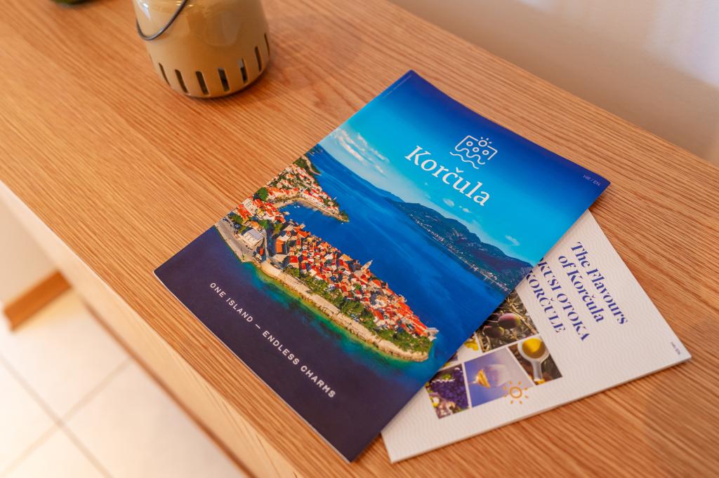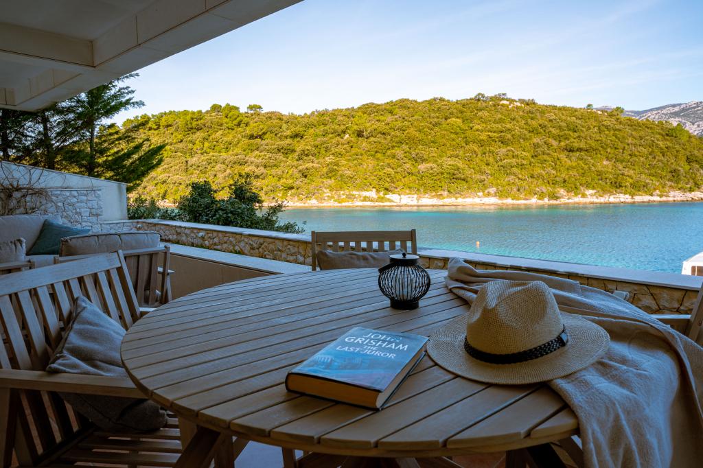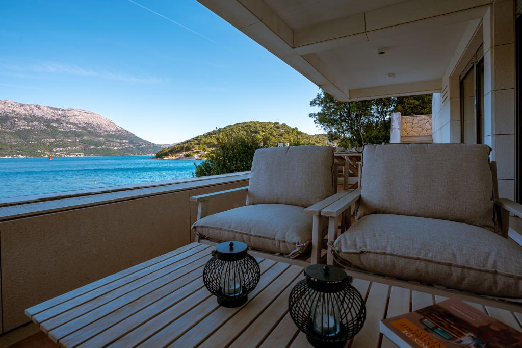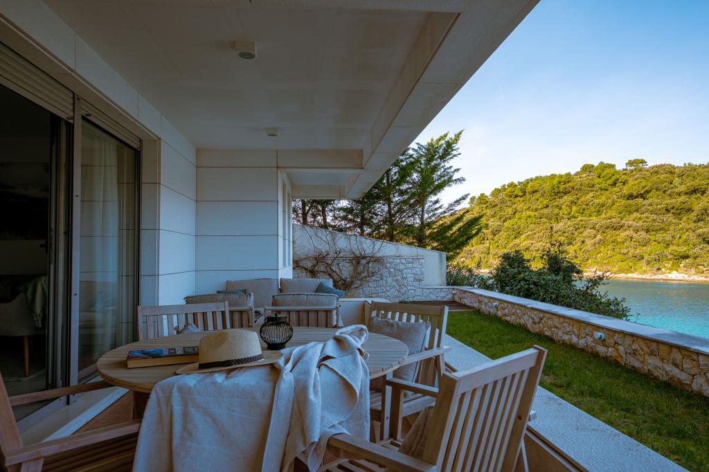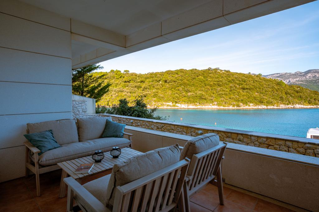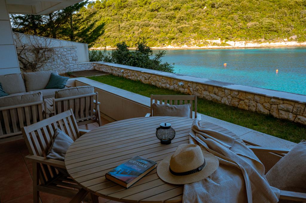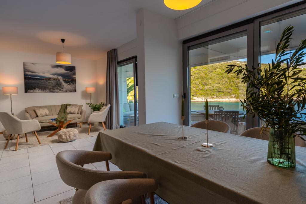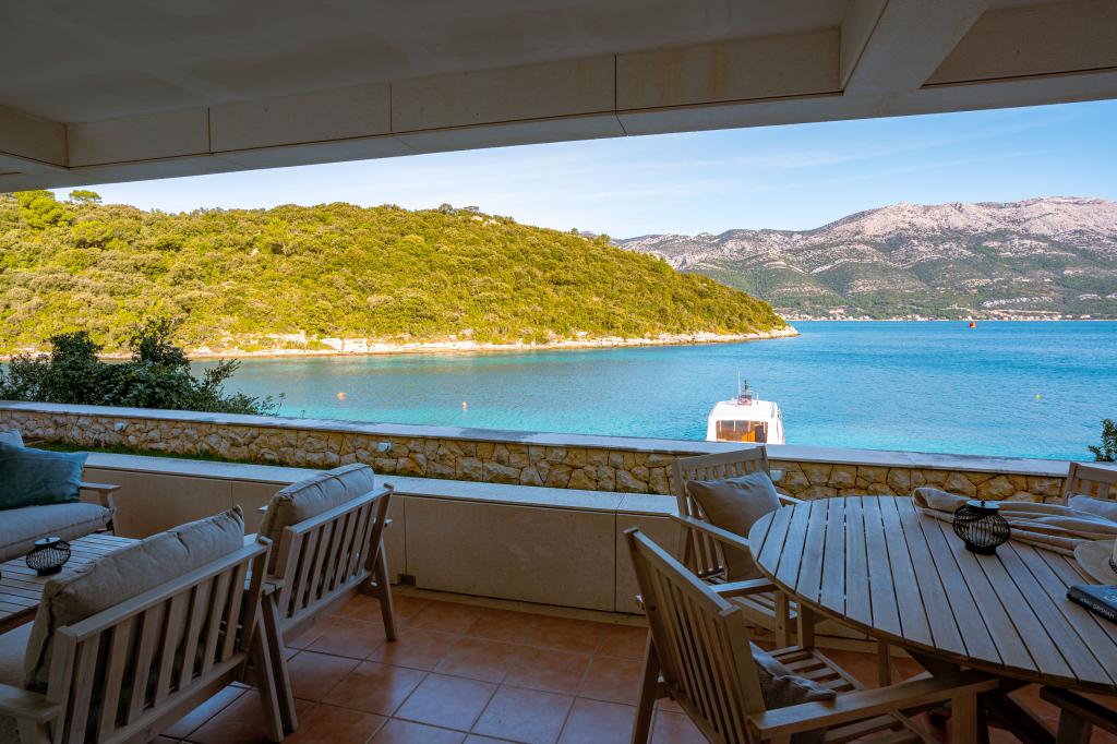 Villa Avantgarde - appartement direct aan zee voor 4 personen - zeer rustige baai - eiland Korčula - Kroatië Het is het werk van een beroemde Kroatische en wereldberoemde architect. Het ligt in een rustige baai, ca. 4 km van het stadscentrum. In de villa beschikt u over een comfortabel appartement van ca. 100 m2, bestaande uit 2 slaapkamers, een badkamer en een woonkamer met een goed uitgeruste keuken, eetkamer en woonkamer, van waaruit toegang is tot een ruim terras met directe toegang tot het privéstrand. Het strand ligt op 9 meter van het appartement. Er is slechts één appartement te huur in de Villa. Het wordt omgeven door verzorgde gazons, groen, vogelgezang en de zee. Er is afgesloten privéparkeergelegenheid beschikbaar voor gasten. De slaapkamer, woonkamer, eetkamer en terras kijken direct uit op zee. Het kan het hele jaar door gebruikt worden, omdat het voorzien is van centrale verwarming.