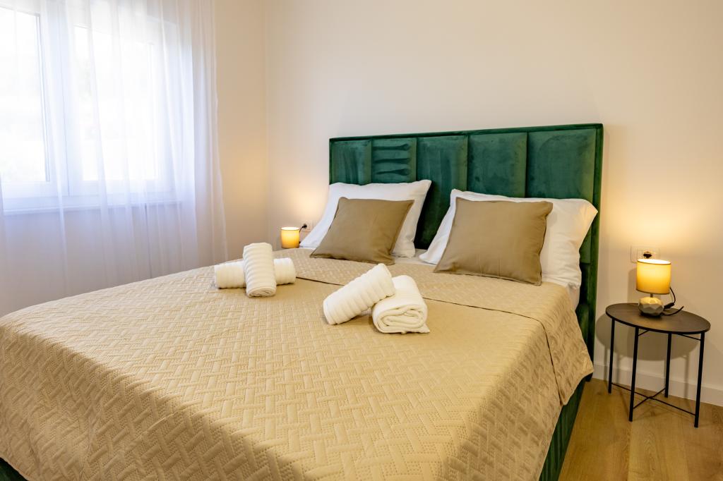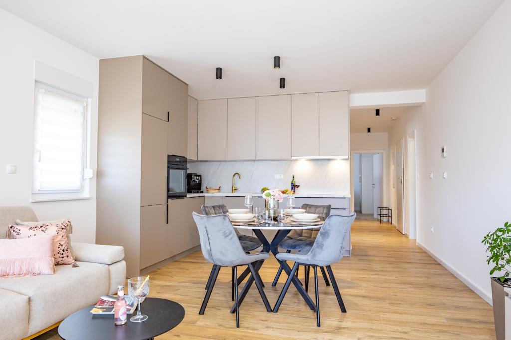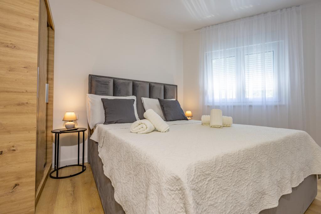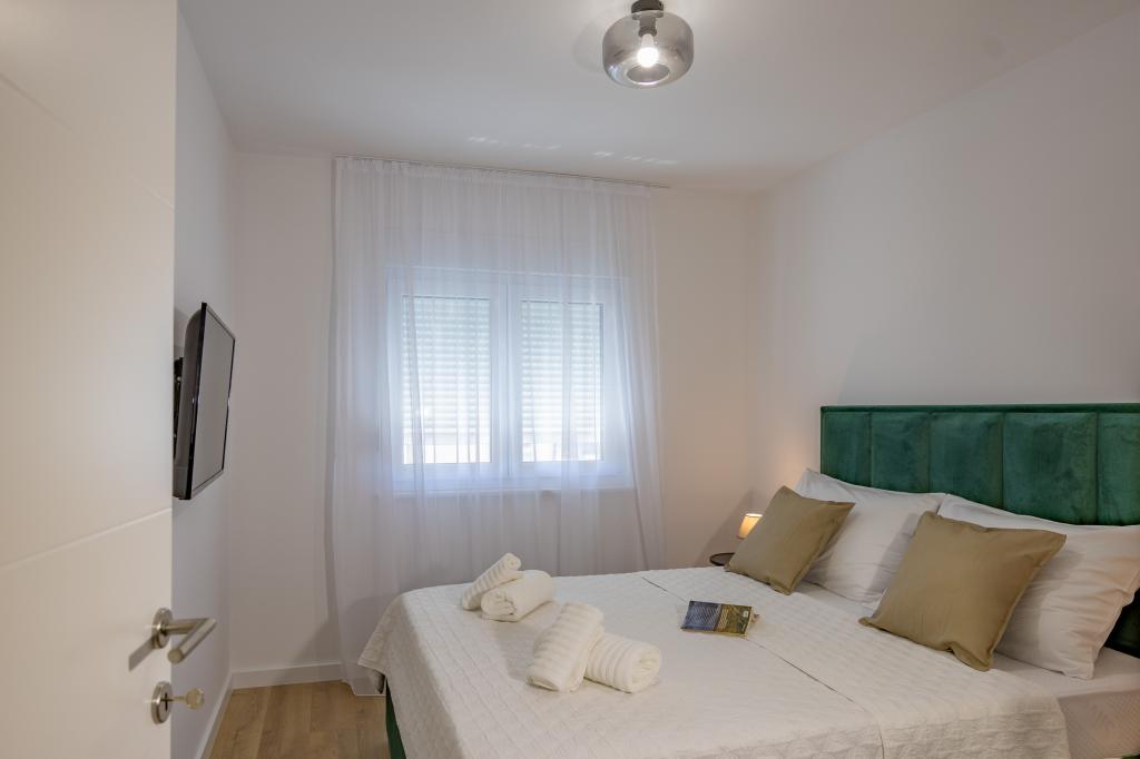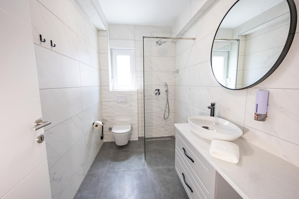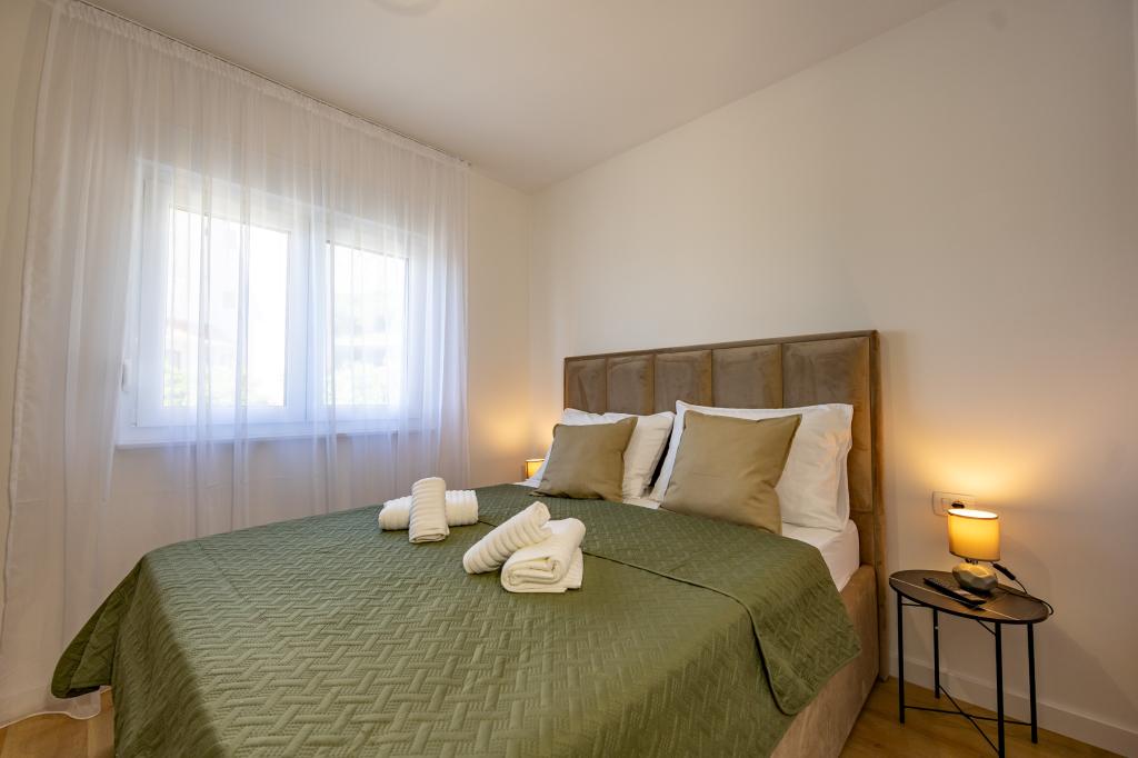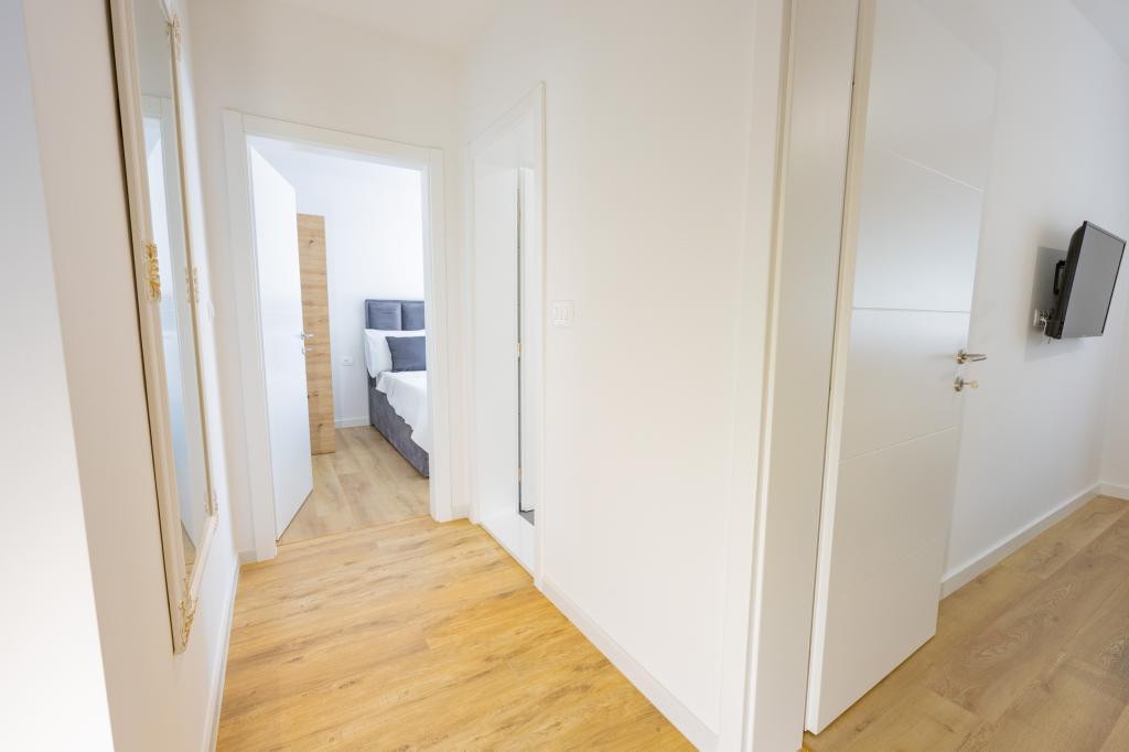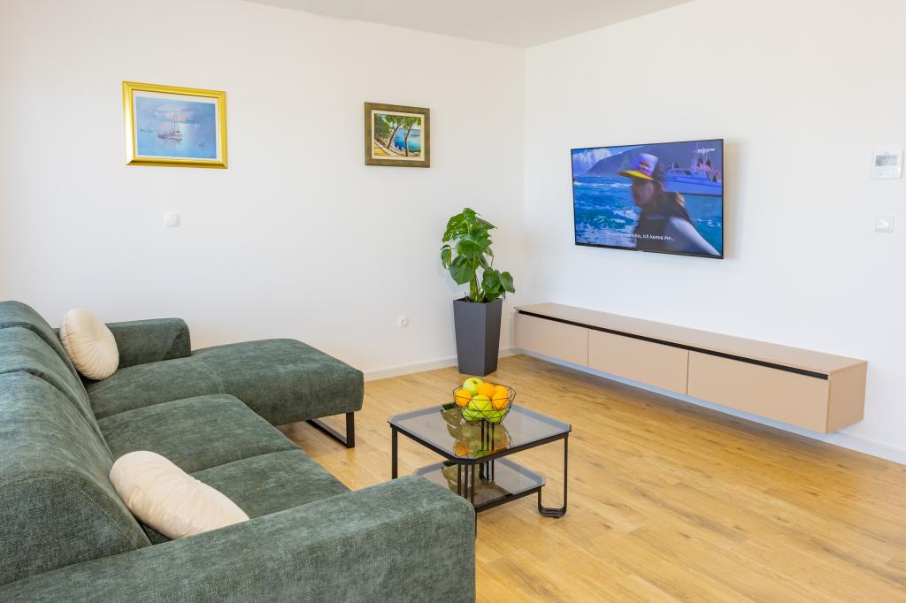 Elk appartement straalt modern design en een onlangs gerenoveerd interieur uit. In de ruime woonkamer, ingericht met smaakvol meubilair en eigentijdse details, voelt u zich meteen thuis. Het open concept verbindt de woonkamer op natuurlijke wijze met een volledig uitgeruste keuken, waar elegante aanrechtbladen, hoogwaardige apparatuur en alle ruimte die u nodig heeft om uw favoriete maaltijden te bereiden, op u wachten. De woonkamer komt uit op een aangenaam balkon - een ideale plek voor een kopje koffie in de ochtend of een avondje ontspannen met een glas wijn en een onvergetelijke zonsondergang boven de Adriatische Zee. Elk appartement beschikt over twee comfortabele slaapkamers met tweepersoonsbedden, voorzien van zacht beddengoed en veel opbergruimte, een moderne badkamer en een extra toilet. De appartementen zijn voorzien van airconditioning en van alle gemakken voorzien: satelliet-tv, internet, wasmachine, vaatwasser, koffiezetapparaat en alles wat u nodig heeft voor een aangenaam en zorgeloos verblijf.