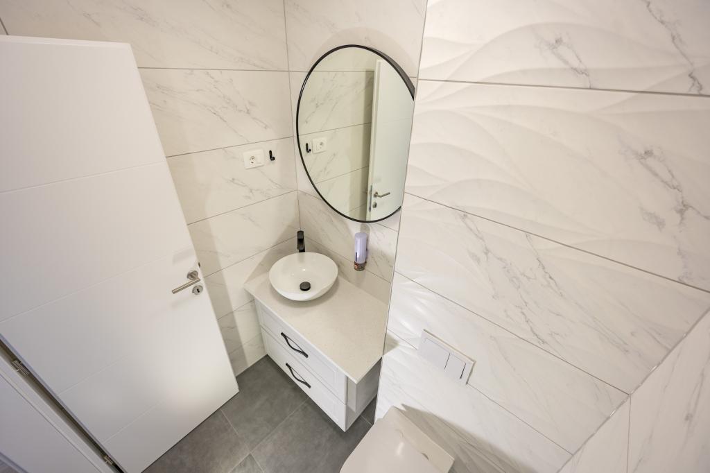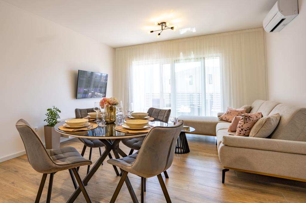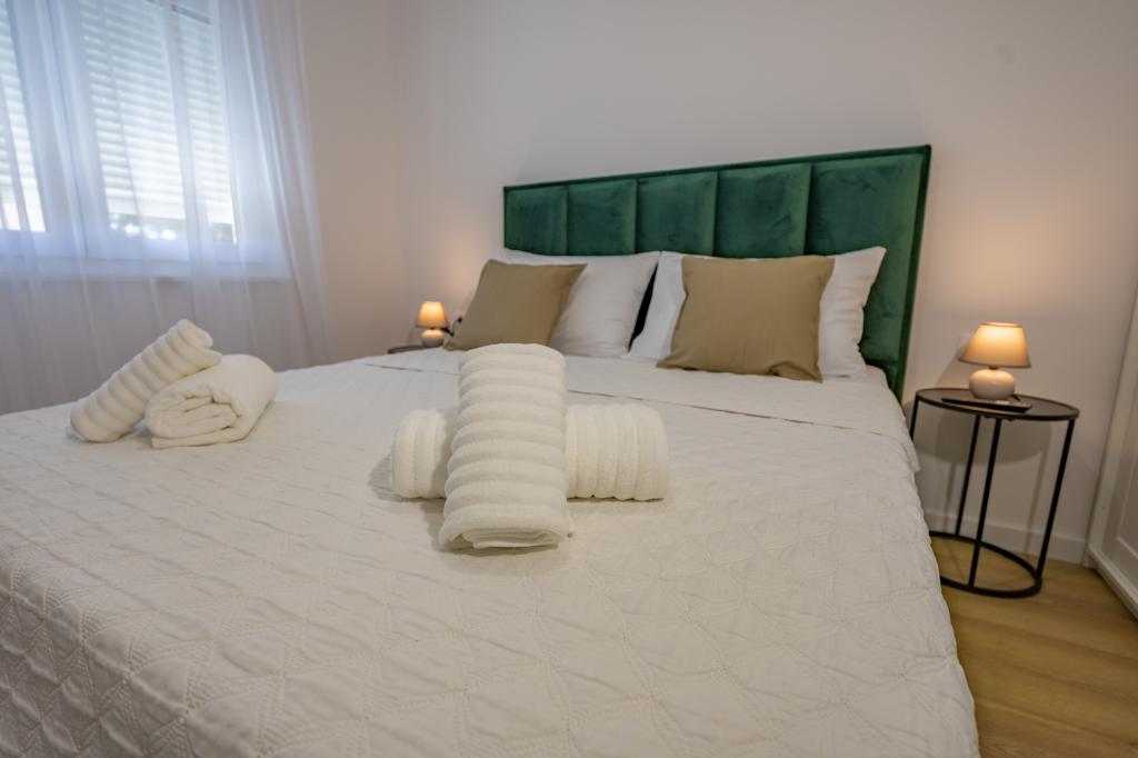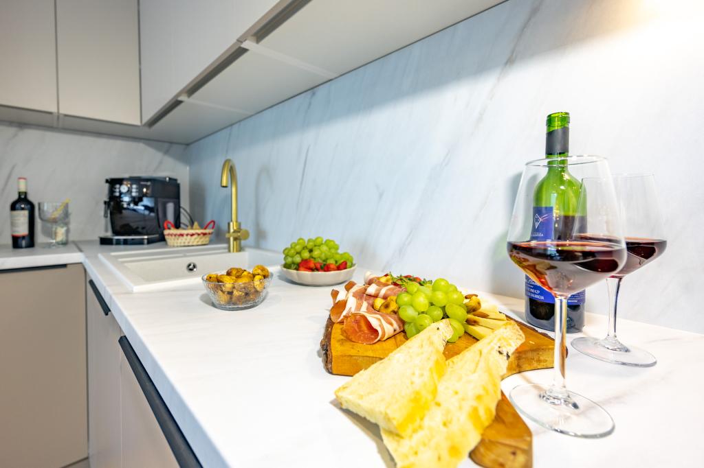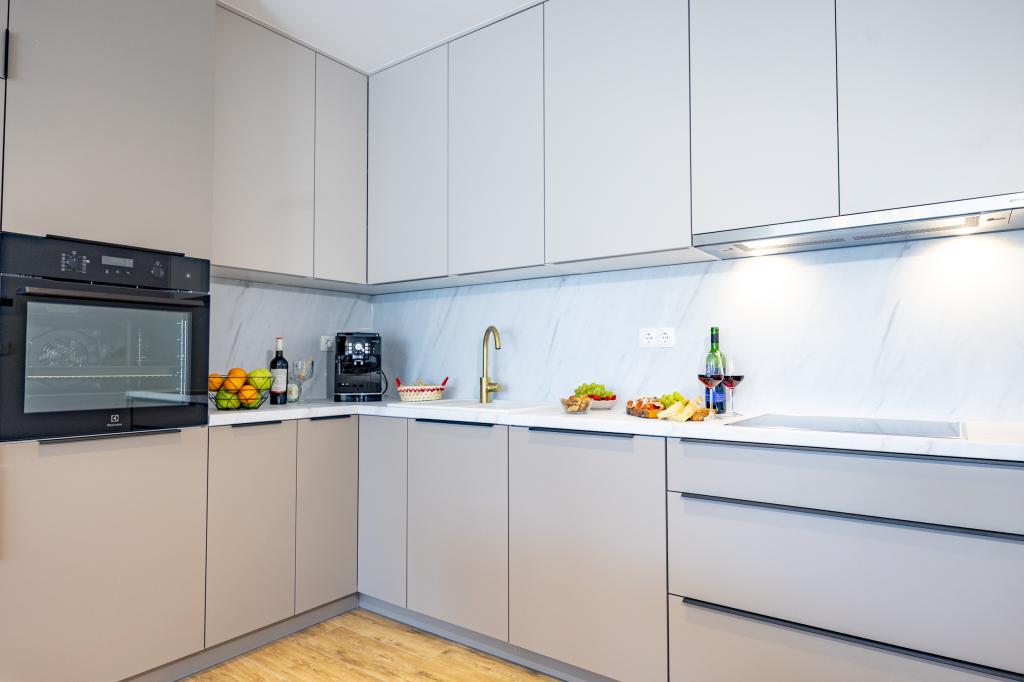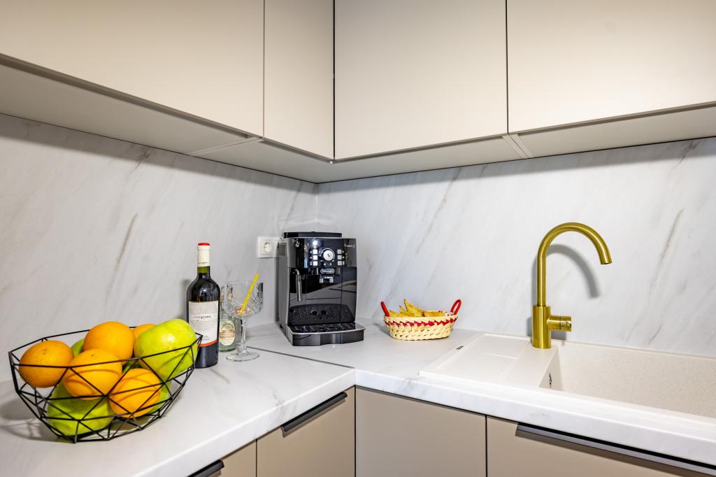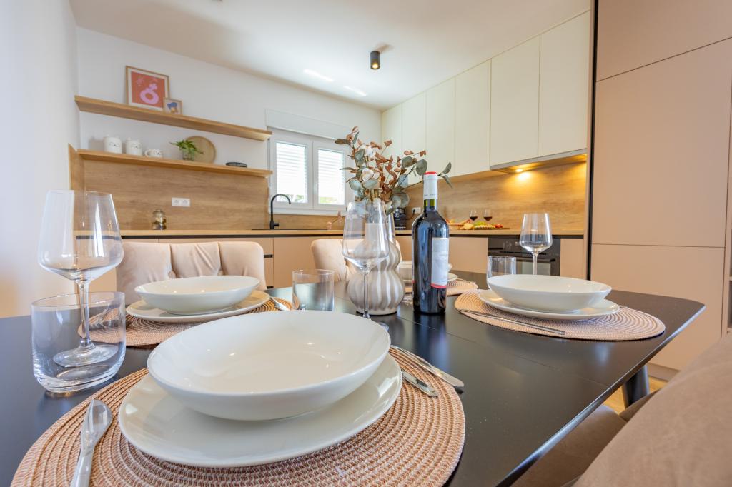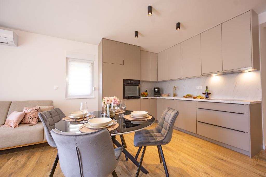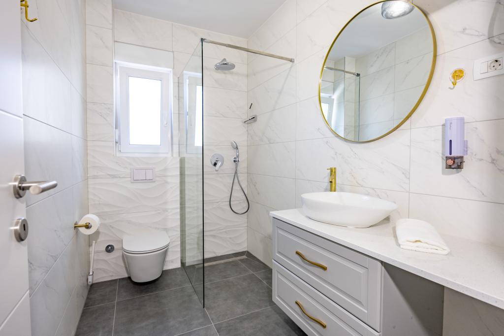 Elk appartement straalt modern design en een onlangs gerenoveerd interieur uit. In de ruime woonkamer, ingericht met smaakvol meubilair en eigentijdse details, voelt u zich meteen thuis. Het open concept verbindt de woonkamer op natuurlijke wijze met een volledig uitgeruste keuken, waar elegante aanrechtbladen, hoogwaardige apparatuur en alle ruimte die u nodig heeft om uw favoriete maaltijden te bereiden, op u wachten. De woonkamer komt uit op een aangenaam balkon - een ideale plek voor een kopje koffie in de ochtend of een avondje ontspannen met een glas wijn en een onvergetelijke zonsondergang boven de Adriatische Zee. Elk appartement beschikt over twee comfortabele slaapkamers met tweepersoonsbedden, voorzien van zacht beddengoed en veel opbergruimte, een moderne badkamer en een extra toilet. De appartementen zijn voorzien van airconditioning en van alle gemakken voorzien: satelliet-tv, internet, wasmachine, vaatwasser, koffiezetapparaat en alles wat u nodig heeft voor een aangenaam en zorgeloos verblijf.