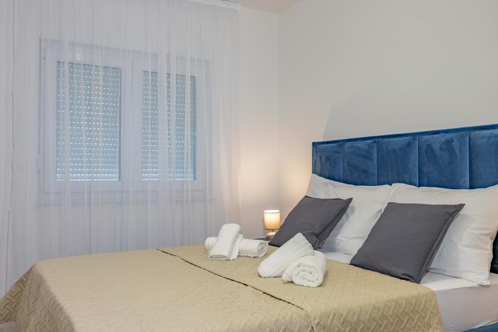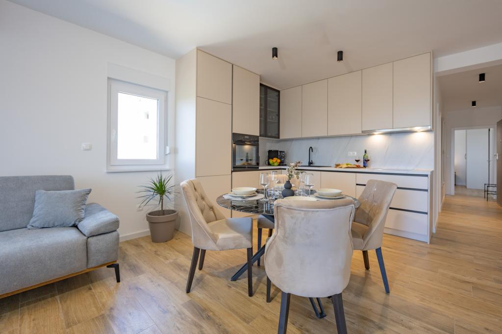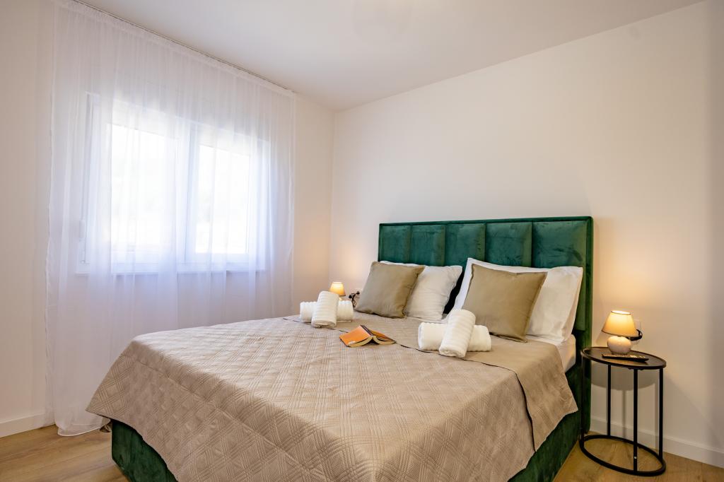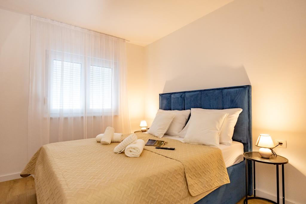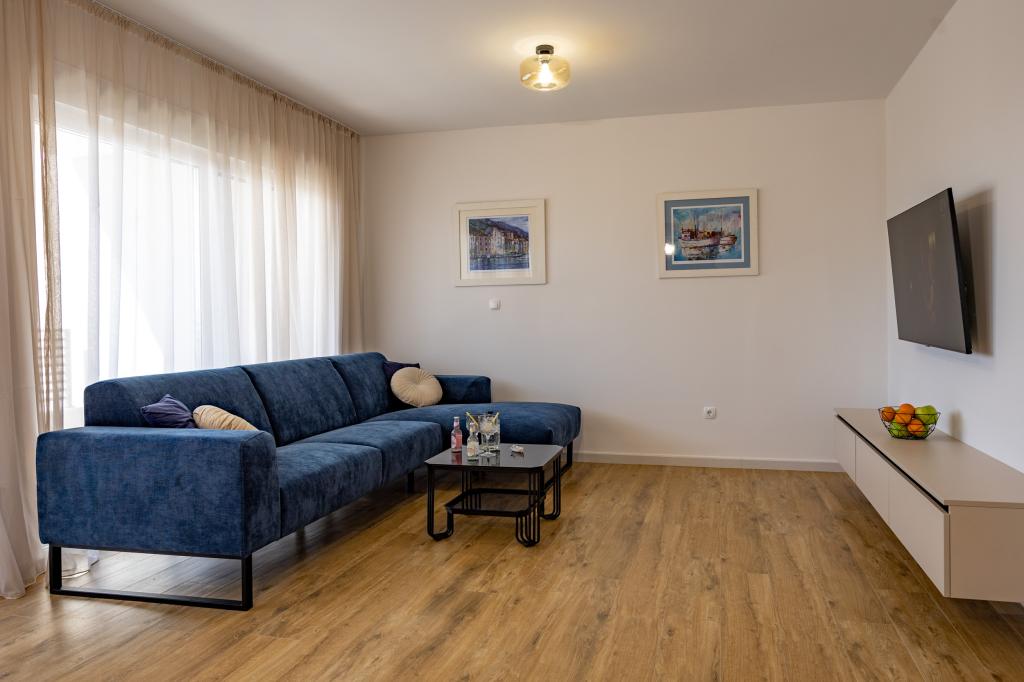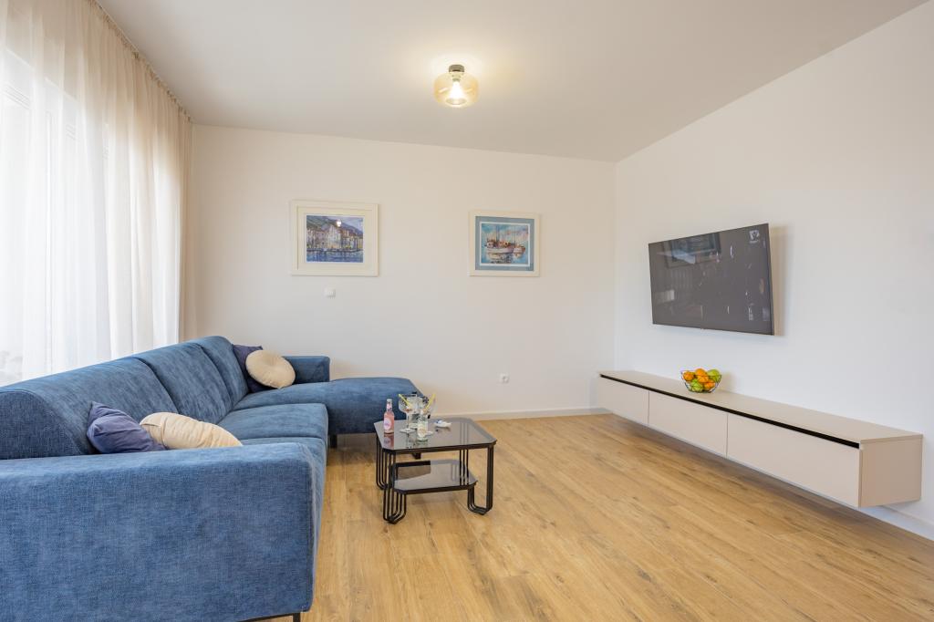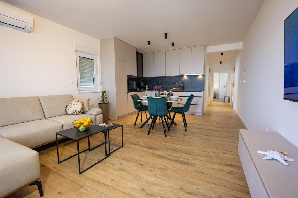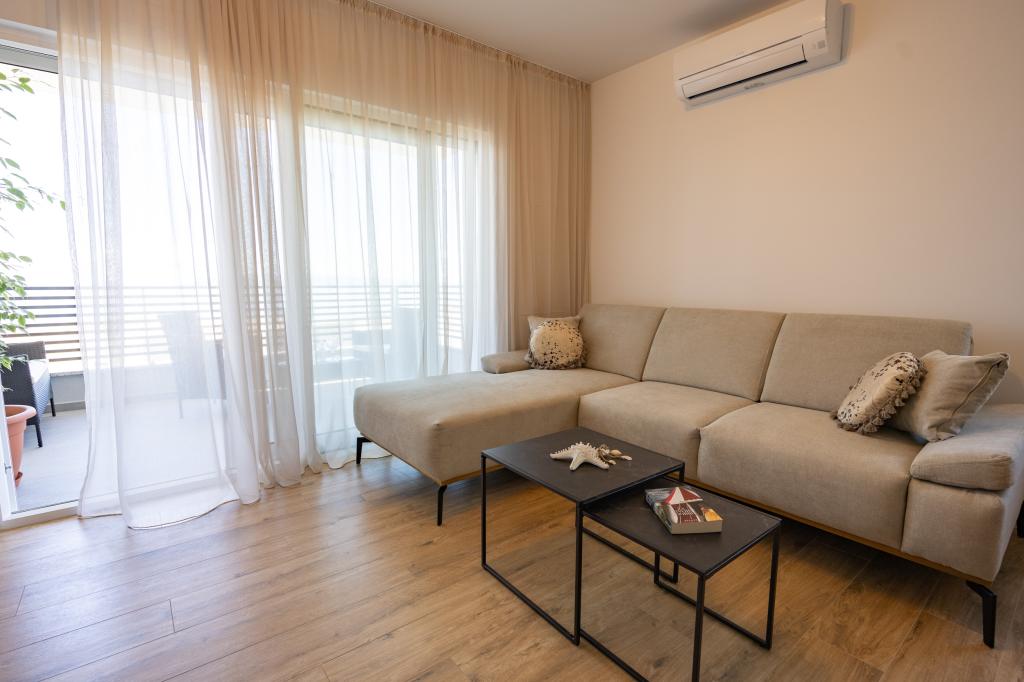 Elk appartement straalt modern design en een onlangs gerenoveerd interieur uit. In de ruime woonkamer, ingericht met smaakvol meubilair en eigentijdse details, voelt u zich meteen thuis. Het open concept verbindt de woonkamer op natuurlijke wijze met een volledig uitgeruste keuken, waar elegante aanrechtbladen, hoogwaardige apparatuur en alle ruimte die u nodig heeft om uw favoriete maaltijden te bereiden, op u wachten. De woonkamer komt uit op een aangenaam balkon - een ideale plek voor een kopje koffie in de ochtend of een avondje ontspannen met een glas wijn en een onvergetelijke zonsondergang boven de Adriatische Zee. Elk appartement beschikt over twee comfortabele slaapkamers met tweepersoonsbedden, voorzien van zacht beddengoed en veel opbergruimte, een moderne badkamer en een extra toilet. De appartementen zijn voorzien van airconditioning en van alle gemakken voorzien: satelliet-tv, internet, wasmachine, vaatwasser, koffiezetapparaat en alles wat u nodig heeft voor een aangenaam en zorgeloos verblijf.