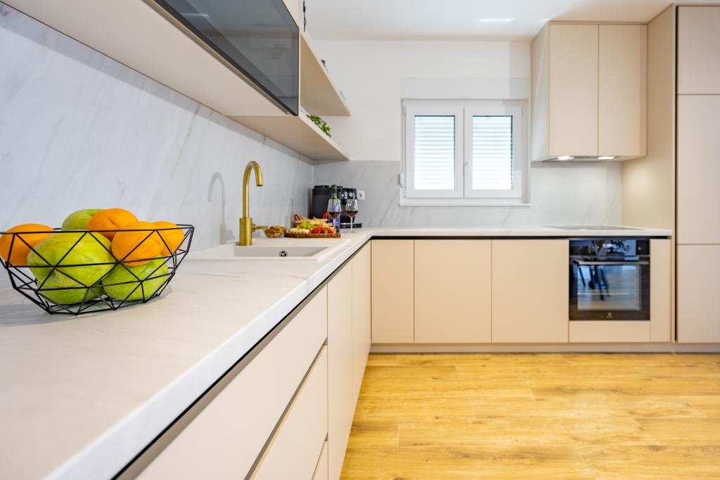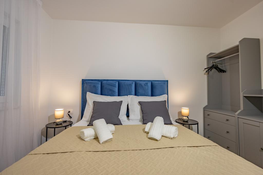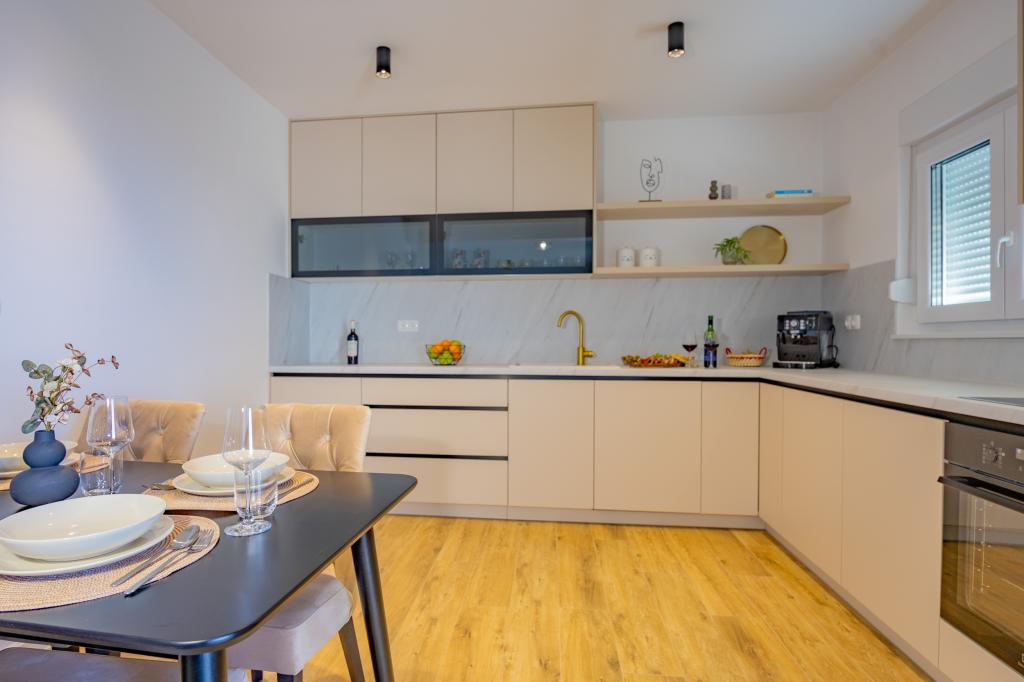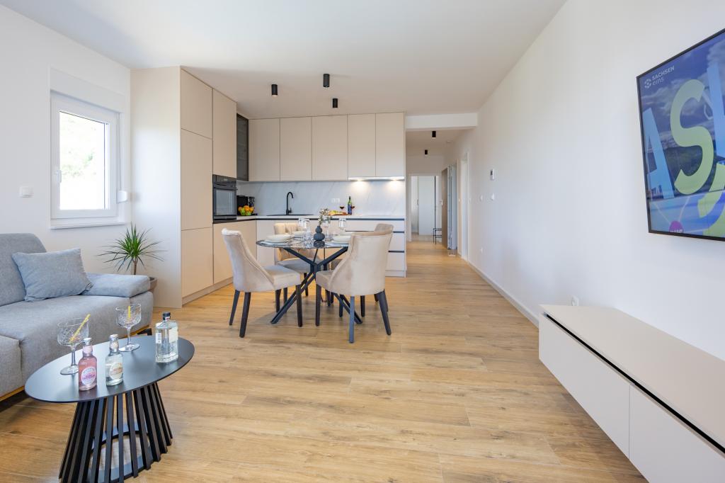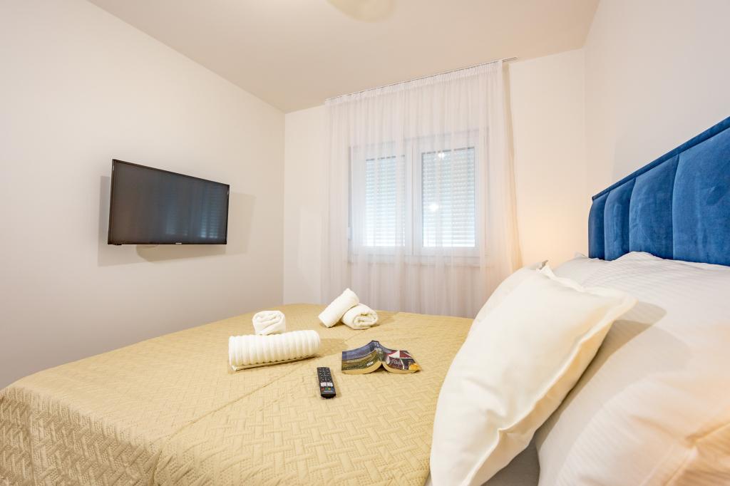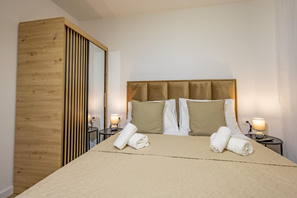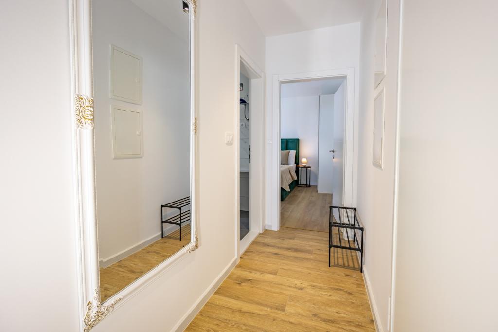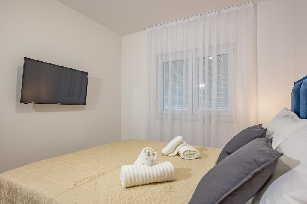 Elk appartement straalt modern design en een onlangs gerenoveerd interieur uit. In de ruime woonkamer, ingericht met smaakvol meubilair en eigentijdse details, voelt u zich meteen thuis. Het open concept verbindt de woonkamer op natuurlijke wijze met een volledig uitgeruste keuken, waar elegante aanrechtbladen, hoogwaardige apparatuur en alle ruimte die u nodig heeft om uw favoriete maaltijden te bereiden, op u wachten. De woonkamer komt uit op een aangenaam balkon - een ideale plek voor een kopje koffie in de ochtend of een avondje ontspannen met een glas wijn en een onvergetelijke zonsondergang boven de Adriatische Zee. Elk appartement beschikt over twee comfortabele slaapkamers met tweepersoonsbedden, voorzien van zacht beddengoed en veel opbergruimte, een moderne badkamer en een extra toilet. De appartementen zijn voorzien van airconditioning en van alle gemakken voorzien: satelliet-tv, internet, wasmachine, vaatwasser, koffiezetapparaat en alles wat u nodig heeft voor een aangenaam en zorgeloos verblijf.
