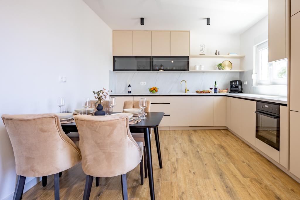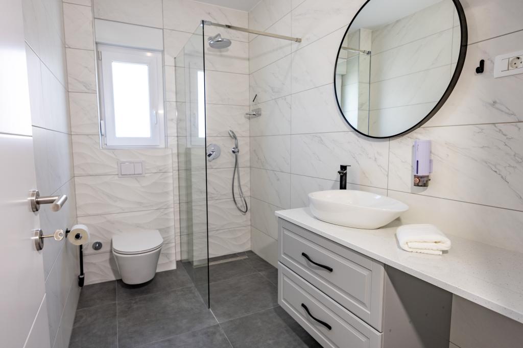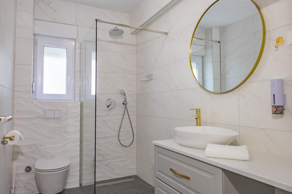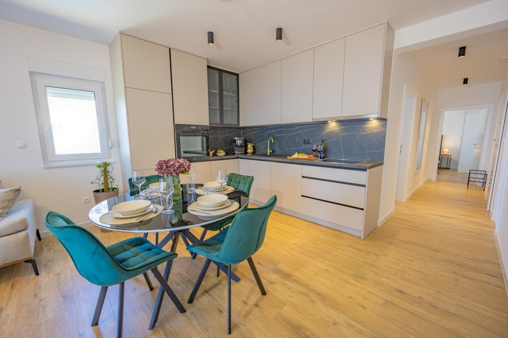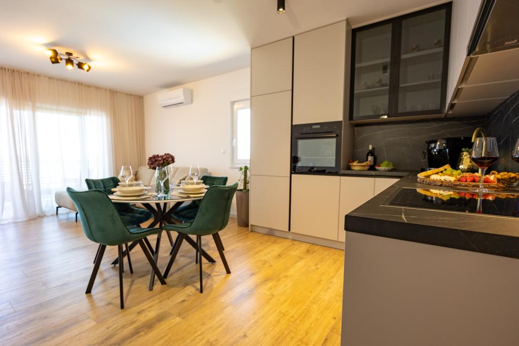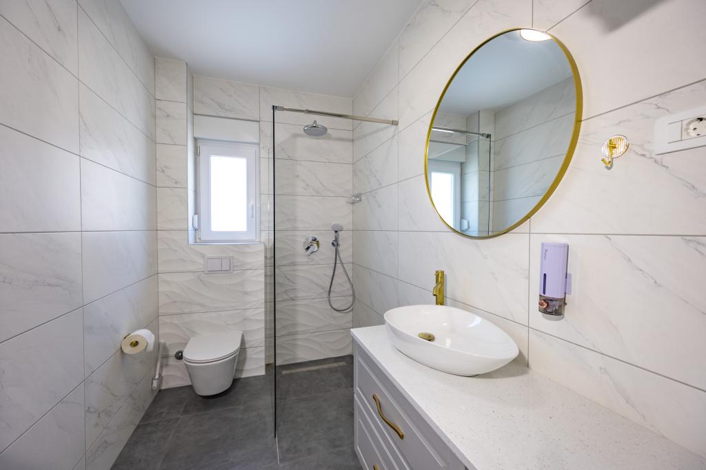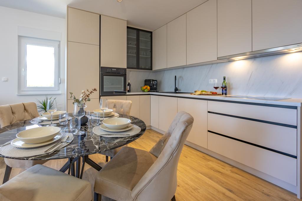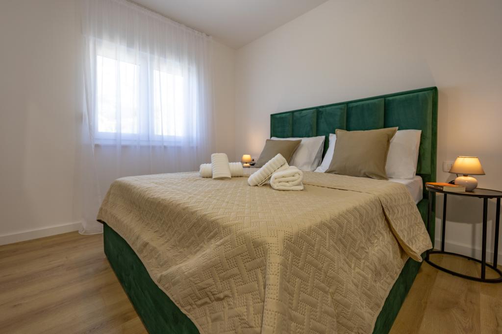 Elk appartement straalt modern design en een onlangs gerenoveerd interieur uit. In de ruime woonkamer, ingericht met smaakvol meubilair en eigentijdse details, voelt u zich meteen thuis. Het open concept verbindt de woonkamer op natuurlijke wijze met een volledig uitgeruste keuken, waar elegante aanrechtbladen, hoogwaardige apparatuur en alle ruimte die u nodig heeft om uw favoriete maaltijden te bereiden, op u wachten. De woonkamer komt uit op een aangenaam balkon - een ideale plek voor een kopje koffie in de ochtend of een avondje ontspannen met een glas wijn en een onvergetelijke zonsondergang boven de Adriatische Zee. Elk appartement beschikt over twee comfortabele slaapkamers met tweepersoonsbedden, voorzien van zacht beddengoed en veel opbergruimte, een moderne badkamer en een extra toilet. De appartementen zijn voorzien van airconditioning en van alle gemakken voorzien: satelliet-tv, internet, wasmachine, vaatwasser, koffiezetapparaat en alles wat u nodig heeft voor een aangenaam en zorgeloos verblijf.