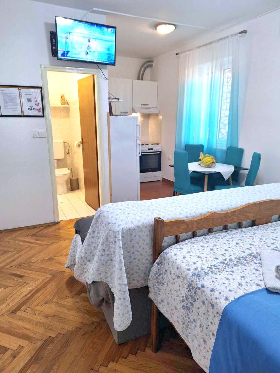 Studio appartement Donna heeft drie sterren. Het is gelegen op de begane grond van een gebouw in een rustig deel van de stad Mali Lošinj. Het appartement is bedoeld voor twee personen met een extra bed voor een andere persoon of kind. Gratis WiFi en parkeergelegenheid zijn beschikbaar binnen de faciliteit (u ontvangt een sleutel). Het appartement heeft een terras waar u de dag kunt beginnen met het drinken van uw eerste ochtendkoffie. Het onlangs gerenoveerde appartement is uitgerust met de nodige kleine en grote huishoudelijke apparaten (televisie, internet, airconditioning, wasmachine, waterkoker, haardroger, strijkijzer). In verband met de opkomst van het coronavirus hebben wij alle preventieve maatregelen genomen om ervoor te zorgen dat u veilig bent tijdens uw verblijf in het appartement. Bij de ingang van het appartement staat handgel voor u klaar. Het dichtstbijzijnde strand van Valdarka ligt op 200 meter afstand. Het strand heeft natuurlijke schaduw, schone zee, goed onderhouden entree en kinderspeelplaats. Er zijn tal van andere stranden in de buurt die u kunt bezoeken en iets voor u kunt vinden (zon, schaduw, zand, rotsen, bars, restaurants, enz.). Uw kind zal zich aangetrokken voelen tot Aquapark Čikat, met buitenzwembaden en een waterglijbaan. Alles wat u nodig heeft voor een leuke en kwalitatieve vakantie bevindt zich niet ver van het appartement (winkels Lidl, Konzum, Jadranka, DM, Bipa, apotheken en talrijke restaurants). In de buurt van het appartement is er een van de vele plaatsen die een bezoek waard zijn in Lošinj, namelijk de Miomirisni vrt, die vol staat met plantenrijkdom en waar u een souvenir kunt kopen. Naast de Miomirisno vrta kunt u ook het thematische uitzichtpunt Providence bezoeken, dat een prachtig uitzicht biedt over de stad, haar baaien en stranden. Als u tijdens uw vakantie iets wilt leren, kunt u een bezoek brengen aan het Apoksiomena-museum, dat aan het water ligt. Als u de stad met de auto wilt zien, staat er ook een toeriste
