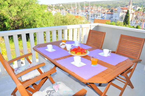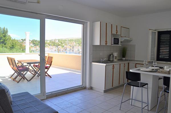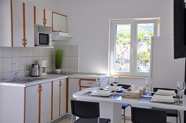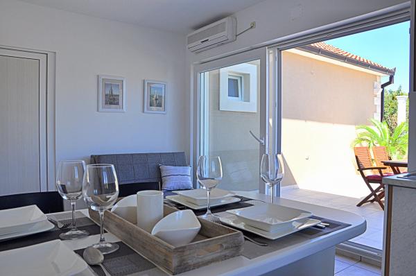 De appartementen liggen in een gezinswoning, die is gelegen op een rustige locatie en op slechts 10 minuten lopen naar het centrum en 15 van het dichtstbijzijnde strand. Wij bieden twee appartementen. A2 (4 1) 60m2 ster bevat een volledig uitgeruste keuken met een uitgang naar een groot terras met een prachtig uitzicht over de baai. Het appartement heeft twee slaapkamers, twee badkamers, die een haardroger en gratis toiletartikelen omvatten. Wasmachine, tv, satelliet, internet en grill. We staan huisdieren. A1- nieuw ingerichte appartement met een 4-sterren, 80m2, twee slaapkamers met een lcd-tv, twee badkamers met douche (föhn en persoonlijke beauty accessoires) ruime woonkamer met een lcd-tv en een moderne slaapbank, een volledig uitgeruste keuken met vaatwasser en een eethoek. Het gehele appartement is voorzien van airconditioning en is voorzien van vloerverwarming, een televisie met satelliet-tv en Wi-Fi internet. Het heeft ook een ruim terras met panoramisch uitzicht over de baai en gratis parkeren en grill