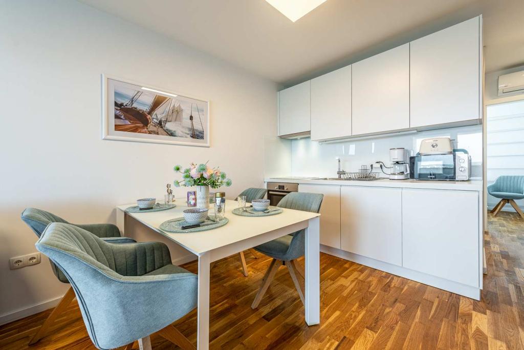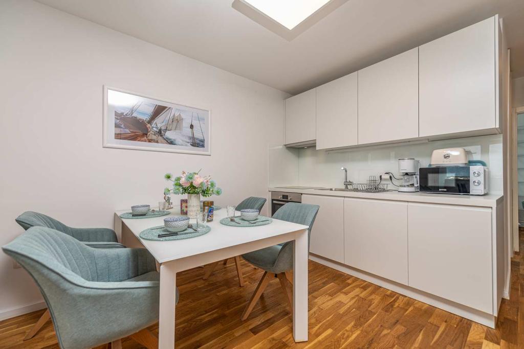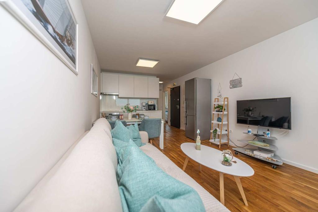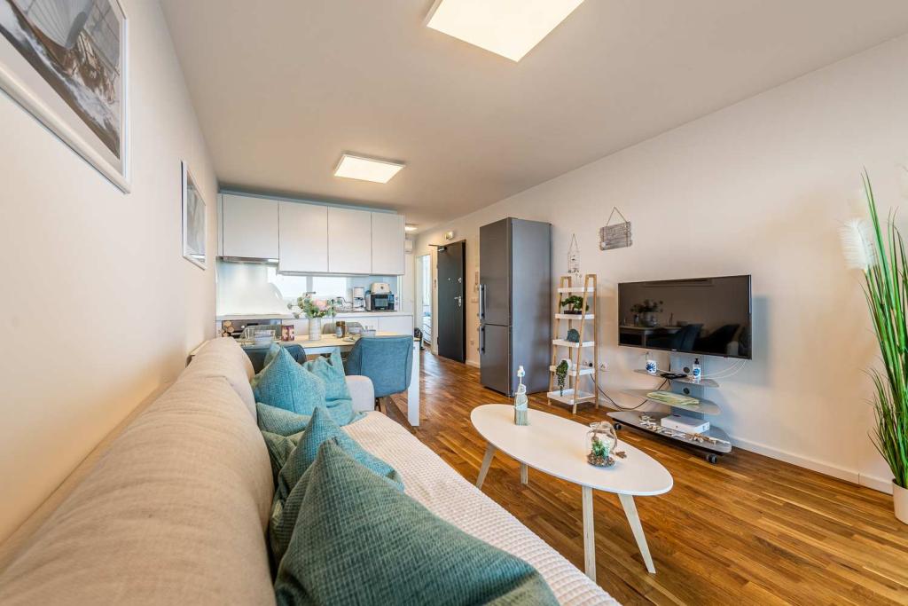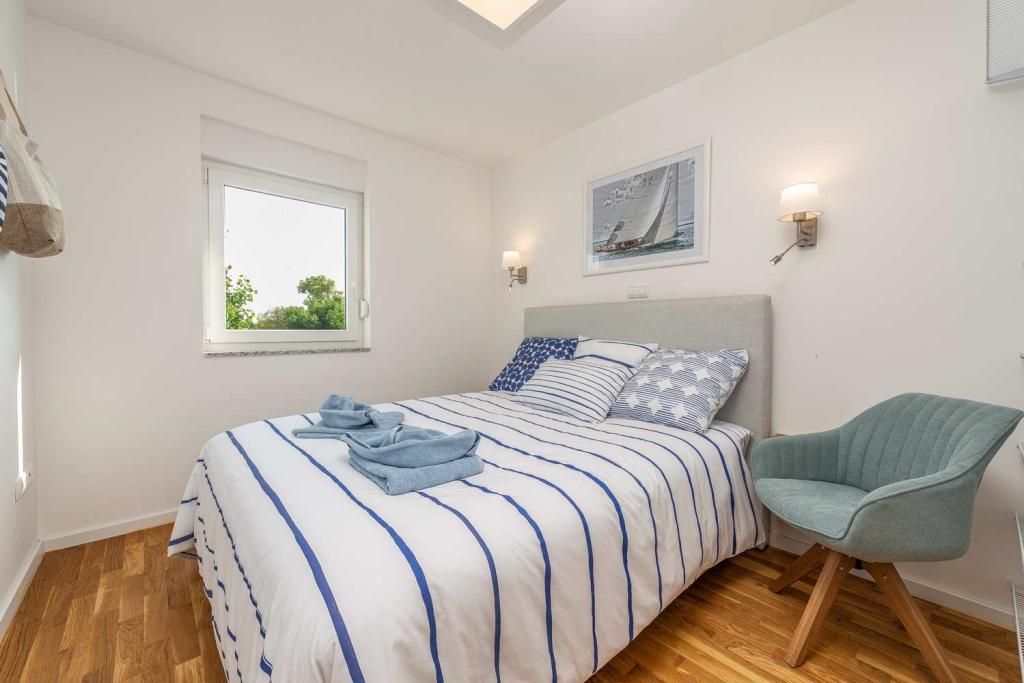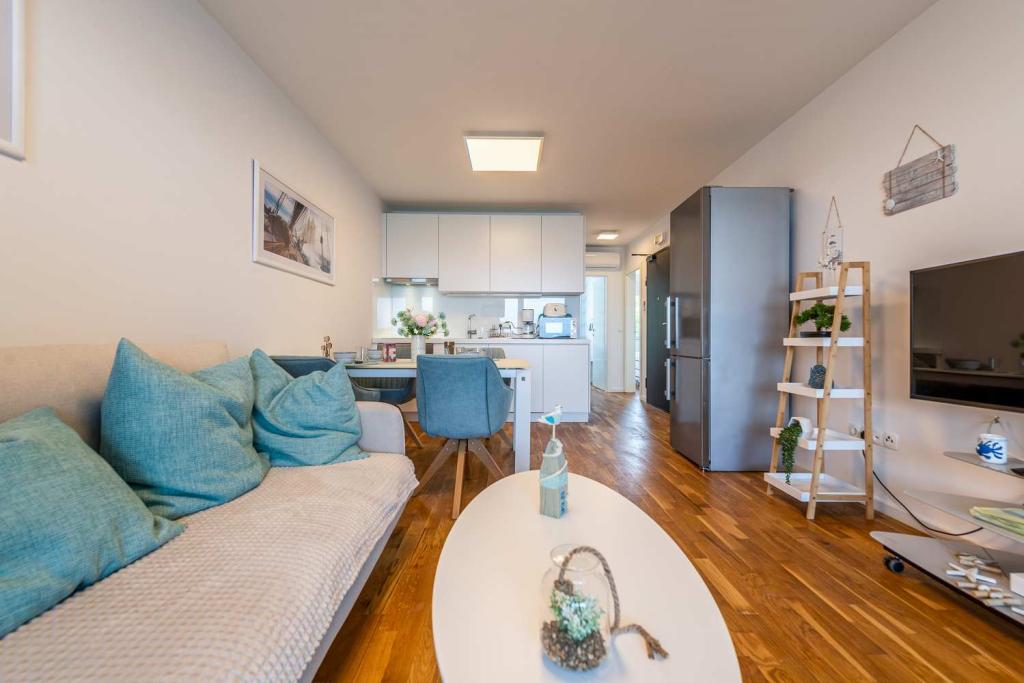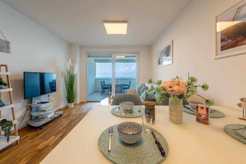 Eerste rij vanaf de zee! 10 meter van het voetgangersstrand. 5 minuten van het oude centrum van Nin. Modern appartement, mooi ingericht, zeer goed uitgeruste keuken (vaatwasser, broodrooster, waterkoker, elektrisch koffiezetapparaat, magnetron, koelkast met vriezer, oven, 4 inductiekookplaten). 1 slaapkamer met tweepersoonsbed + 1 slaapkamer met 2 eenpersoonsbedden. Douche en wasmachine. Fantastisch uitzicht op zee vanaf uw terras.