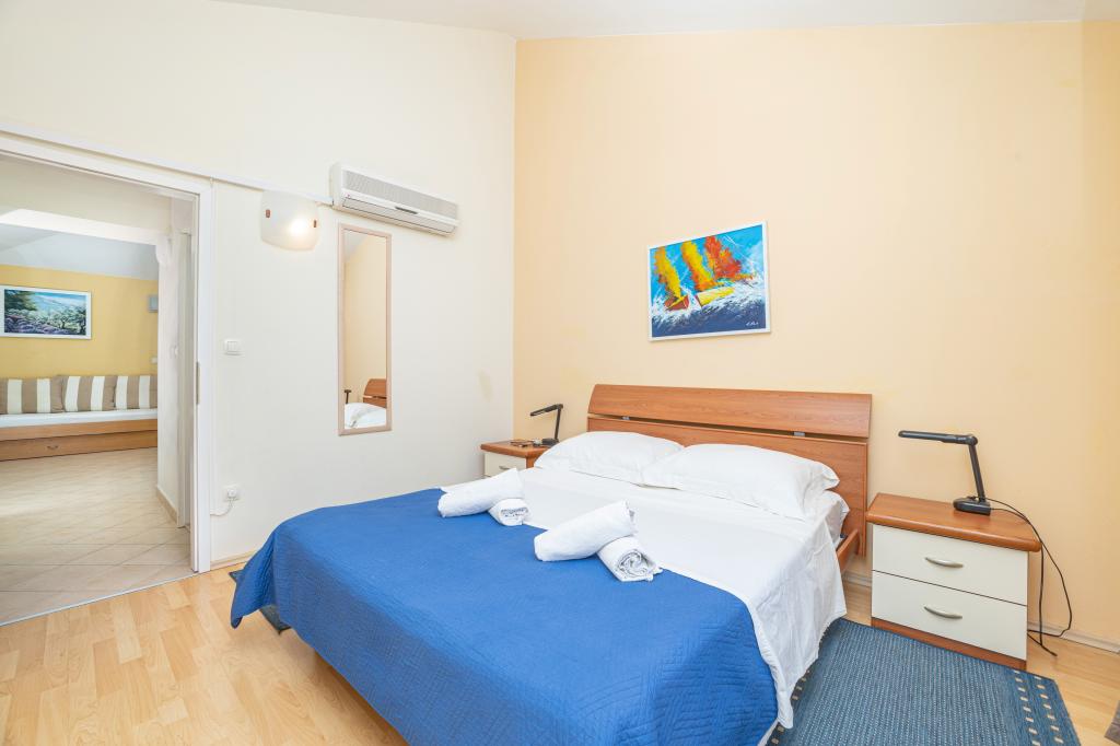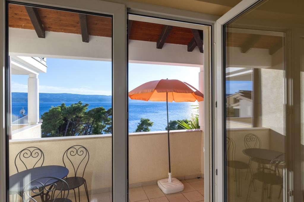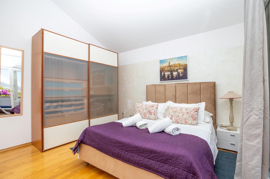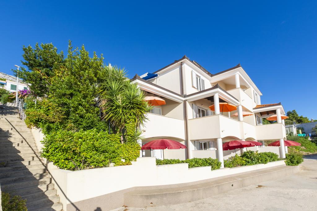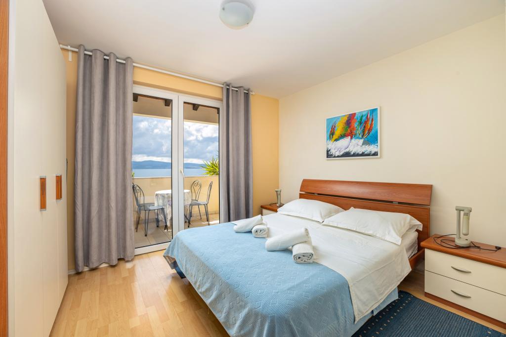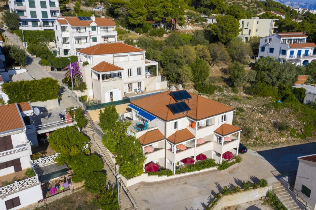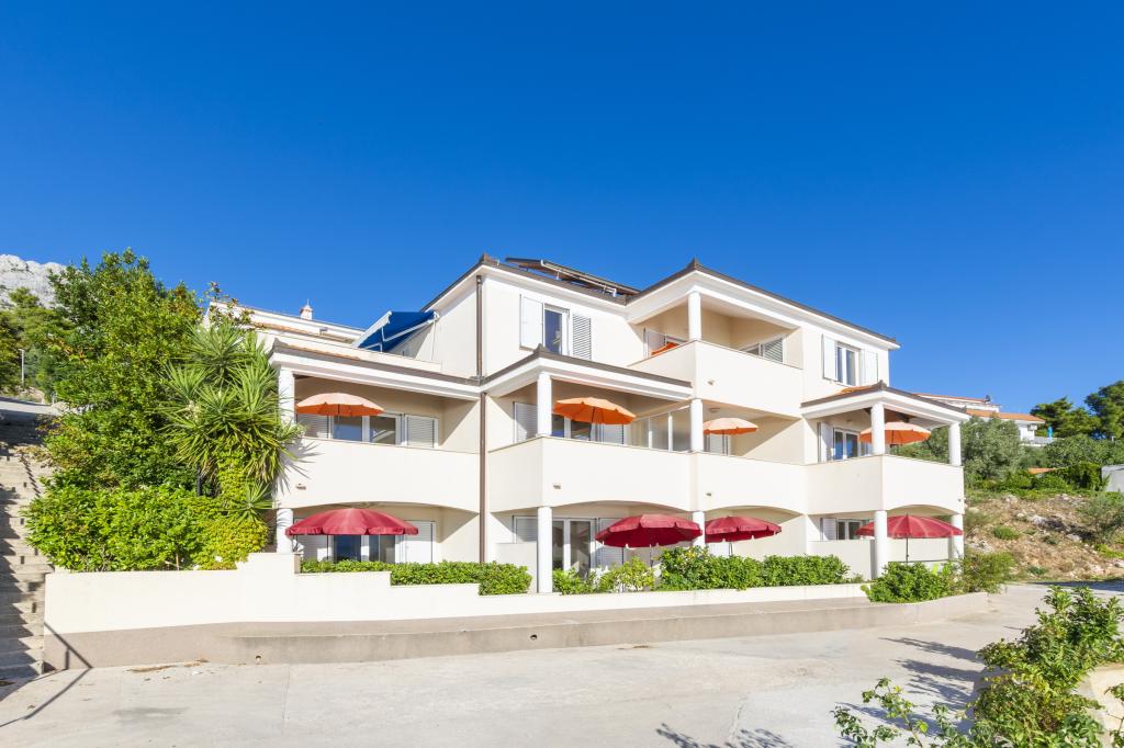 Accommodatie in nieuw gebouwde, uiterst comfortabele en uitstekend uitgeruste appartementen. De accommodatie ligt op 3 km van het centrum van Omiš. In totaal acht appartementen, gelegen op de eerste rij aan zee. Alle appartementen hebben grote terrassen met uitzicht op zee en het eiland Brač. Parkeerplaatsen direct naast de villa. De appartementen bevinden zich onder de hoofdweg (300 meter), direct aan zee en een groot kiezelstrand. Er zijn vier typen appartementen: type 2+2 met een aparte slaapkamer met tweepersoonsbed en een woonkamer met twee bedden, en vervolgens appartementen type 2+2 met een grote studio, en grote luxe appartementen, type 4+2 met twee slaapkamers met tweepersoonsbed en een grote woonkamer met twee uitschuifbedden, en grote luxe appartementen. Appartement type 14+2, in werkelijkheid een villa met drie verdiepingen, oppervlakte 300m2, met een zwembad van 9x4 meter met verwarmd water, met zeven tweepersoonsslaapkamers, twee grote woonkamers met balkons en terrassen, vier badkamers, apart toilet, buitenbarbecue, sauna en fitnessruimte, enz. Het zwembad wordt uitsluitend gebruikt door appartement A 14+2. De andere appartementen niet.