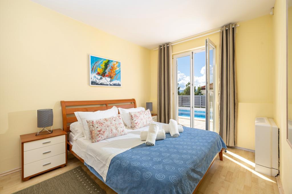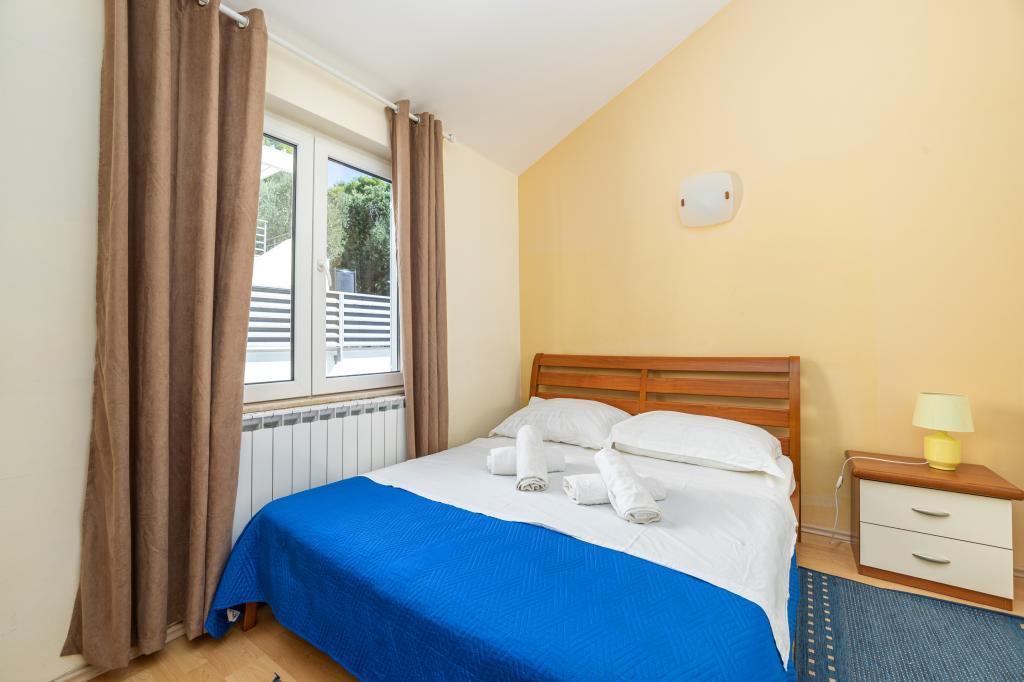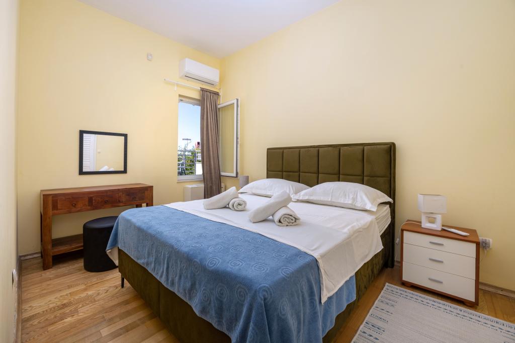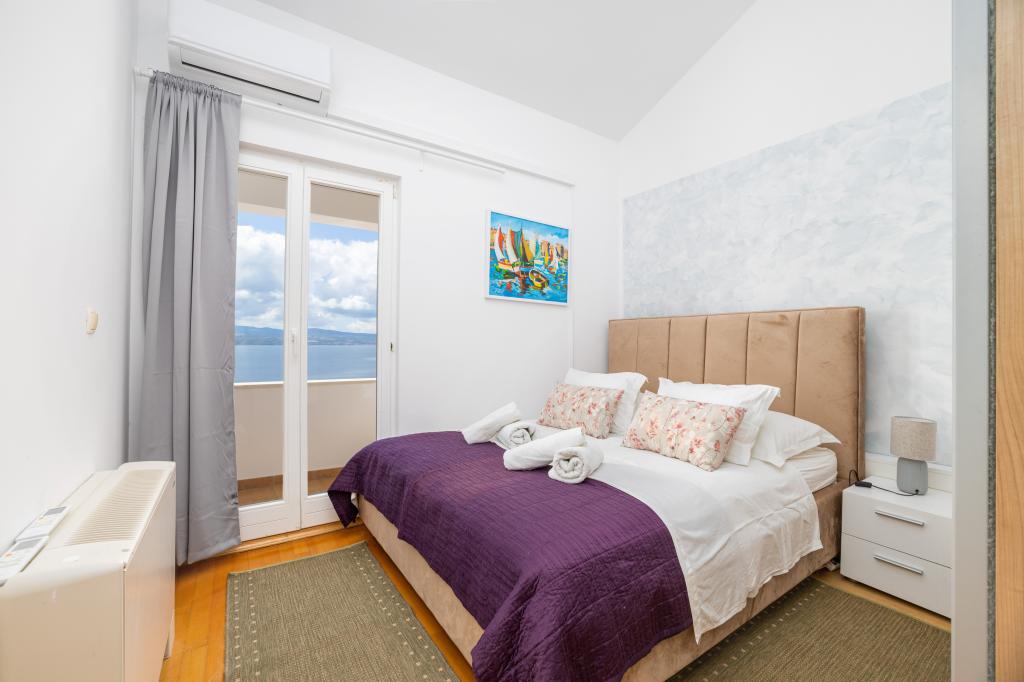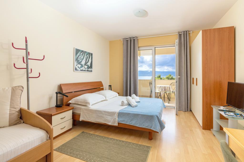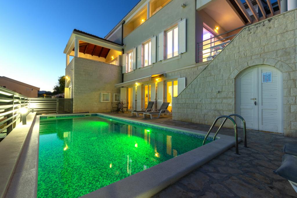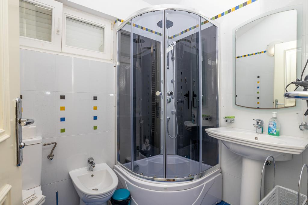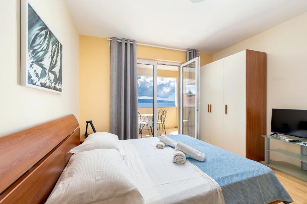 Accommodatie in nieuw gebouwde, uiterst comfortabele en uitstekend uitgeruste appartementen. De accommodatie ligt op 3 km van het centrum van Omiš. In totaal acht appartementen, gelegen op de eerste rij aan zee. Alle appartementen hebben grote terrassen met uitzicht op zee en het eiland Brač. Parkeerplaatsen direct naast de villa. De appartementen bevinden zich onder de hoofdweg (300 meter), direct aan zee en een groot kiezelstrand. Er zijn vier typen appartementen: type 2+2 met een aparte slaapkamer met tweepersoonsbed en een woonkamer met twee bedden, en vervolgens appartementen type 2+2 met een grote studio, en grote luxe appartementen, type 4+2 met twee slaapkamers met tweepersoonsbed en een grote woonkamer met twee uitschuifbedden, en grote luxe appartementen. Appartement type 14+2, in werkelijkheid een villa met drie verdiepingen, oppervlakte 300m2, met een zwembad van 9x4 meter met verwarmd water, met zeven tweepersoonsslaapkamers, twee grote woonkamers met balkons en terrassen, vier badkamers, apart toilet, buitenbarbecue, sauna en fitnessruimte, enz. Het zwembad wordt uitsluitend gebruikt door appartement A 14+2. De andere appartementen niet.