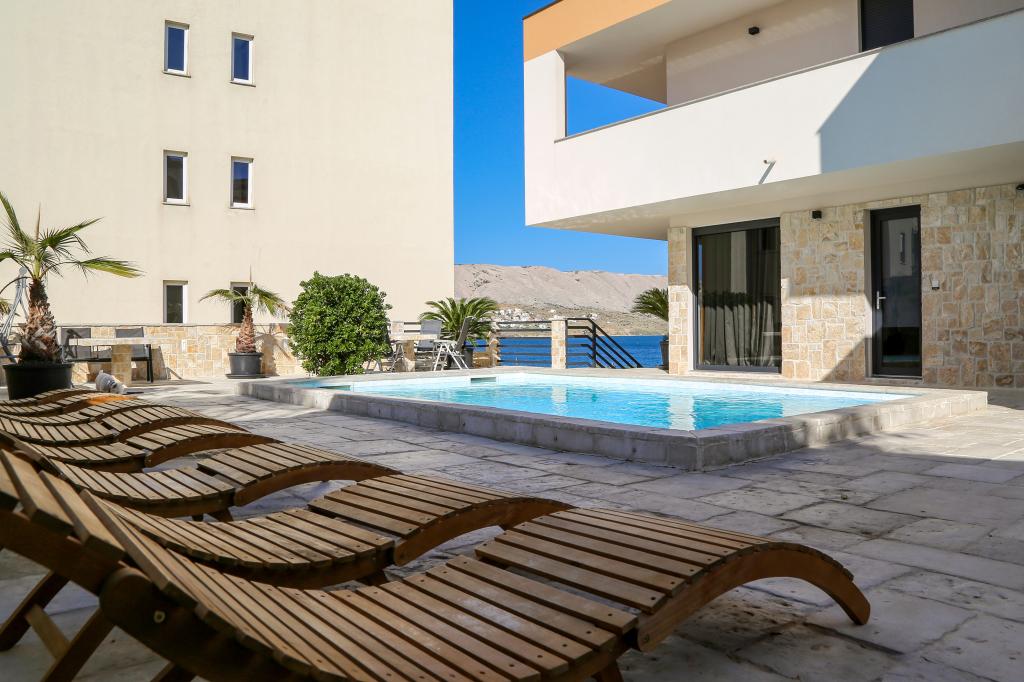 Moderne appartementsvilla met zwembad - eerste rij naar de zee, 400 m van het centrum van Pag - wandeling door de zee. De capaciteit van de accommodatie is 6 appartementen met verschillende afmetingen en interieurs. De appartementen zijn voorzien van airconditioning en modern uitgerust, met ruime terrassen en uitzicht op zee.