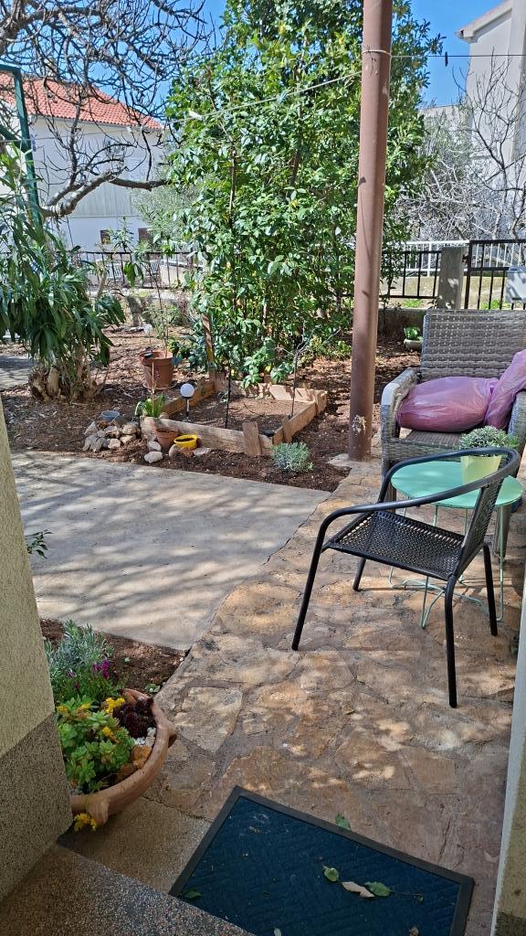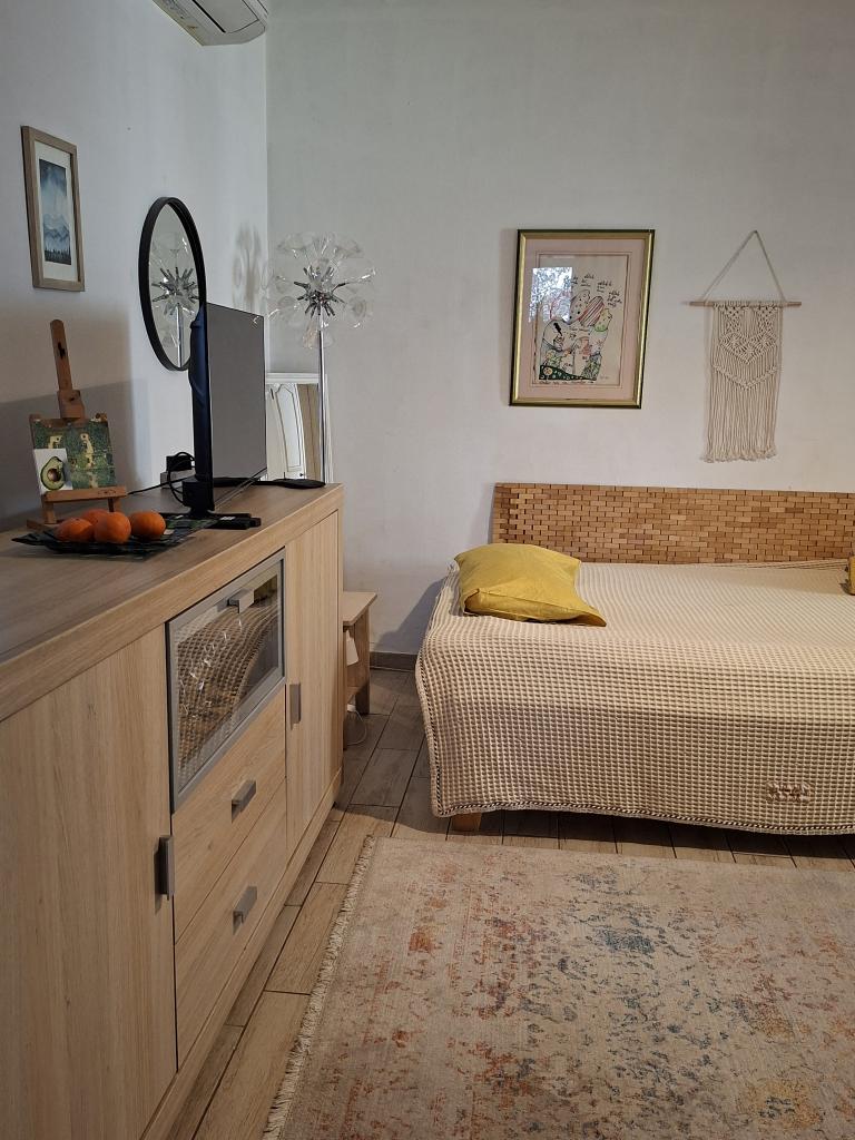 Het appartement Log Inn bevindt zich op de eerste verdieping van een huis met slechts twee appartementen, in een rustig steegje waar gezinnen heerlijk kunnen ontspannen. De tuin van het huis is schaduwrijk met olijf-, vijgen- en dennenbomen en beschikt over een parkeerplaats. Het centrum met winkels, bakkerijen, patisserieën, cafés en restaurants ligt op 10 minuten loopafstand en het eerste kiezelstrand is slechts 5-10 minuten lopen. Log Inn is een aangenaam verblijf, ongeacht het weer. Het is ruim en heeft een aparte woonkamer met speelgoed en prentenboeken. Het is goed uitgerust (servies, waterkoker, koffiezetapparaat, max-tv, wifi, airconditioning) en in de woonkamer kunt u 's avonds in de lente heerlijk ontspannen bij het haardvuur. Het terras met tuinmeubilair is aangenaam en gasten kunnen er graag ontbijten, zonnebaden of van de avond genieten. De studio is kleiner en heeft een kleinere kitchenette, maar dankzij de tuin is het er ook in de zomerse hitte aangenaam. Er is babyuitrusting aanwezig, zoals een reisbedje, babybedje, speelgoed, matje, enz. Beide appartementen beschikken over airconditioning en verwarming. Buiten het hoogseizoen worden ze met korting en per maand verhuurd.