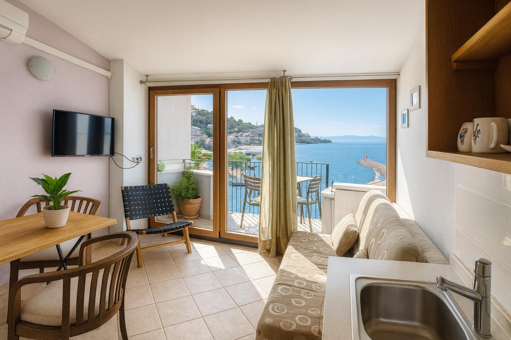 We verbleven begin juli in appartement A1 en ik kan dat appartement iedereen van harte aanbevelen. Perfect uitzicht op de kleine haven, het terras en meer dan groot genoeg om van het uitzicht te genieten, het appartement zelf is prachtig en modern ingericht. Er is veel inhoud in Podgora, van de uitvoering van de klapa (die we konden volgen vanaf het terras van het appartement) tot de rock- en jazzartiesten. Het strand met pijnbomen en schaduw ligt op slechts enkele minuten van het appartement. Parkeren, een supermarkt, een bakkerij en een restaurant liggen op een steenworp afstand van het appartement, wat betekent dat u voor niets een auto hoeft te gebruiken, wat echt fantastisch is. Tot volgend jaar.