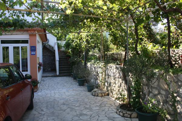 Wij verbleven in een appartement op de begane grond met één slaapkamer. Het appartement is netjes, het terras ligt de hele dag in de schaduw en biedt uitzicht op de olijfgaard. Een prettig appartement, we hadden geen airconditioning nodig. De gastheren waren vriendelijk en toegankelijk, we werden verwelkomd met een zelfgemaakte Rab-cake en omdat ik dol ben op vijgen, plukte mijn tante ze voor me. Ik raad aan
