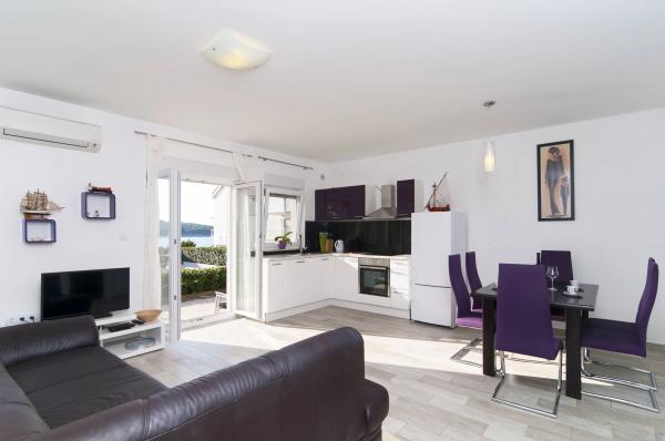 De appartementen locatie is geweldig. Zeer ruime kamers. De volledig ingerichte appartementen hebben een eigen ingang, evenals gratis WiFi. Zeer schone appartementen. Er is gratis parkeergelegenheid beschikbaar op het terrein. Het is zeer rustige plek, maar er is hier alles wat je nodig zou hebben. Slechts 30 meter van een kiezelstrand en mooie zee. Balkon en kamers met uitzicht op zee. Vriendelijke eigenaren.