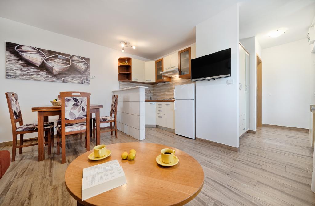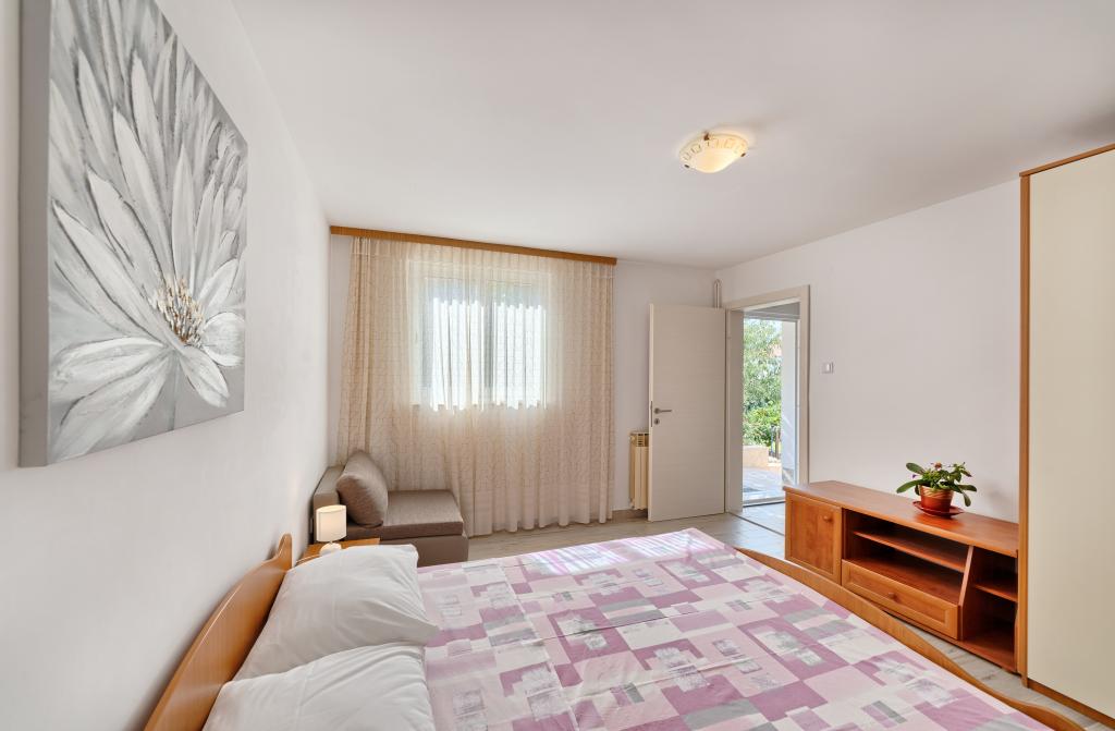 Appartementen Bareta bevinden zich op het eiland Ciovo, gemeente Trogir. Ze bevinden zich op een geweldige locatie voor degenen die willen genieten van de zon en de zee, evenals voor degenen die kennis willen maken met de historische en natuurlijke schoonheden van Midden-Dalmatië. De oude binnenstad van Trogir, die op de werelderfgoedlijst van UNESCO staat, bevindt zich op slechts 1000 meter afstand, terwijl Split (paleis van Diocletianus, veerboten voor eilanden), Omiš, Cetina (raften, canyoning, klimmen), de watervallen van Krka en Sibenik op minder dan 50 km afstand liggen. De luchthaven van Split ligt op slechts 5 km afstand. De appartementen bevinden zich op de begane grond van een familiehuis, omgeven door tuin en groen. Elk appartement heeft een eigen ingang en een groot terras met eettafel, parkeerplaats en barbecue en buitendouche zijn mogelijk. De appartementen bestaan uit een woonkamer verbonden met de keuken, een slaapkamer (bed 2 1, 2 2), mogelijk twee volwassenen met twee kinderen, een badkamer met toilet. De appartementen zijn volledig uitgerust met alles wat u nodig heeft voor een comfortabel verblijf / serviesgoed, beddengoed, enz.) Tr