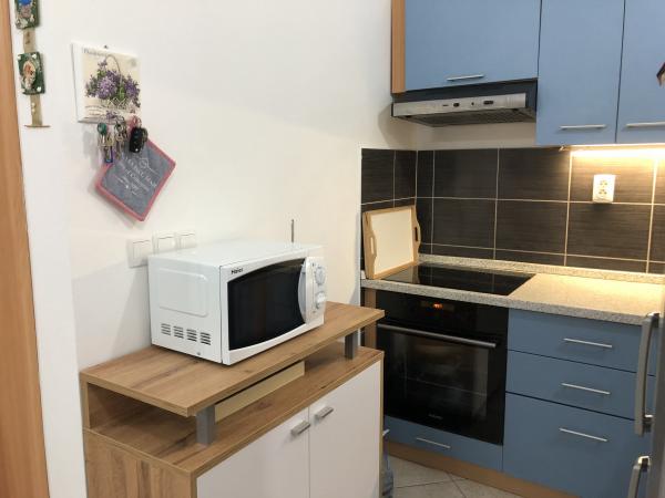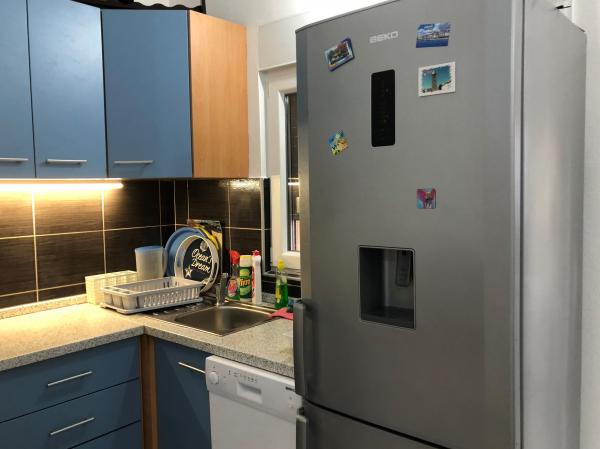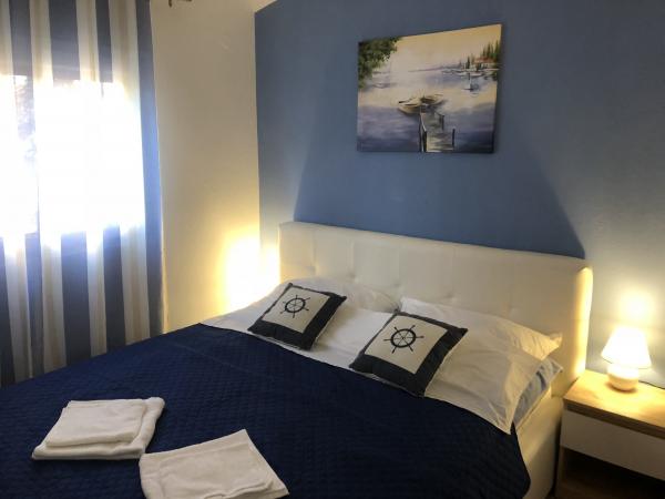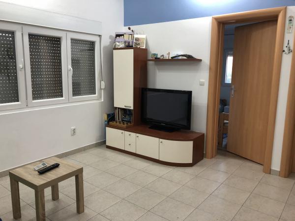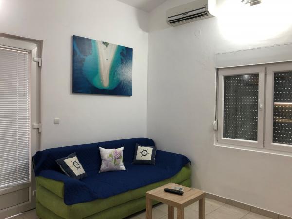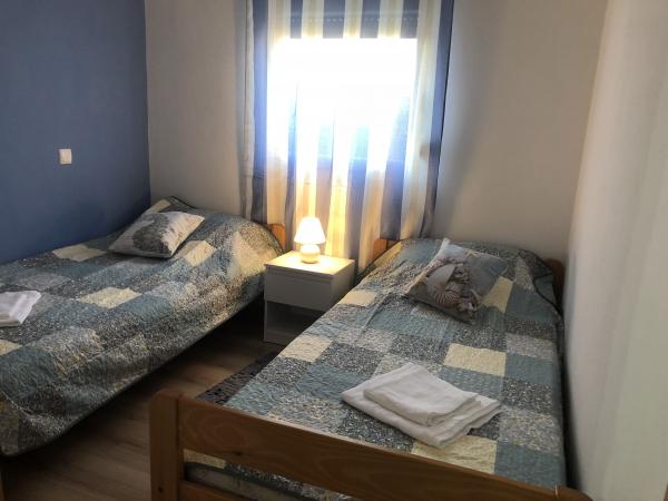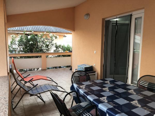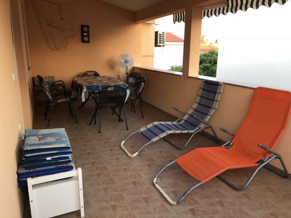 Modern ingericht appartement op 200 m van het strand en gelegen in het eerste deel van het eiland. Het appartement (60 m2) bevindt zich op de eerste verdieping en bestaat uit twee slaapkamers (een tweepersoonsbed en twee aparte bedden). Ruime woonkamer met keuken, badkamer, flatscreen TV en WiFi internet. De keuken heeft een vaatwasser, magnetron, grote koelkast, waterkoker, oven en kookplaat. Het ruime terras (15 m2) is voorzien van een zonnescherm en is overdekt; op het terras staan ligstoelen en een ruime tafel voor 6 personen. Binnen het appartement is het mogelijk om een gemeenschappelijke barbecue en een wasmachine te gebruiken. Het water in het appartement is drinkbaar (van de stadswaterleiding). Er is parkeergelegenheid binnen het gebouw. Roken is alleen toegestaan op het terras.