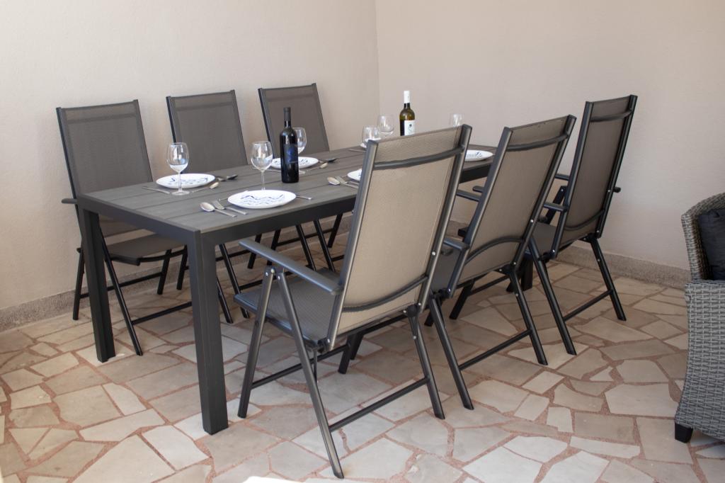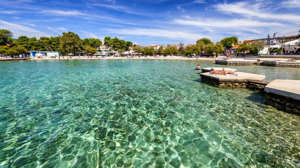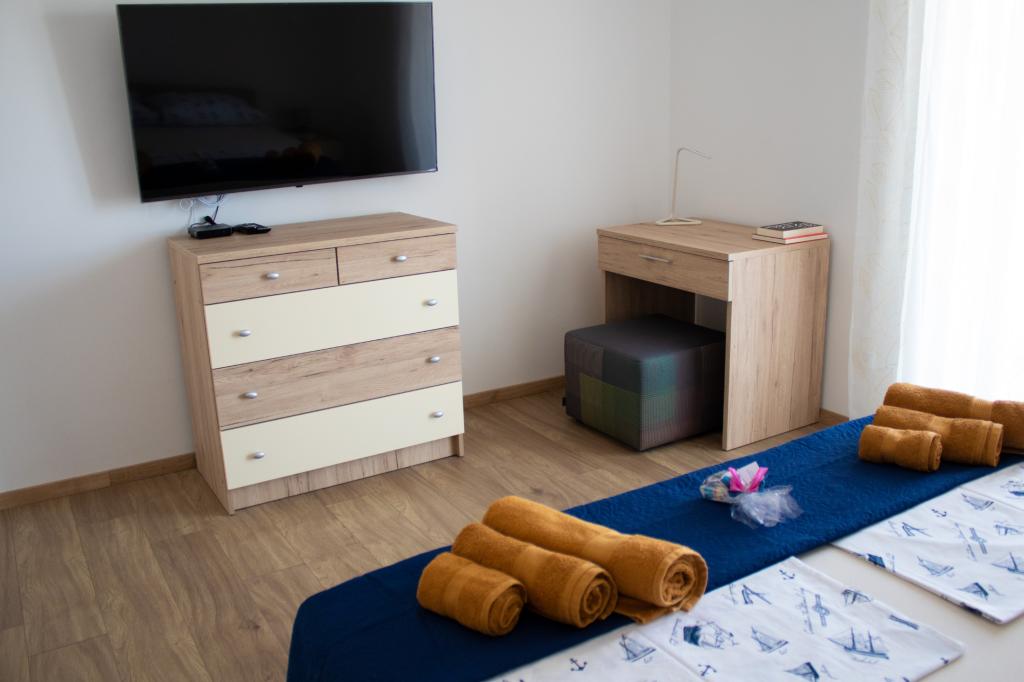 Een ruim driekamerappartement met terras, groot balkon en een eigen parkeerplaats beslaat de gehele 1e verdieping van een onlangs geheel gerenoveerd huis aan de hoofdstraat in het centrum van Vodice. Het is perfect gelegen in de directe omgeving van de ACI-jachthaven, tussen twee grote stadsstranden. Binnen 100 meter vindt u de stadsmarkt, de vismarkt, winkels, postkantoor, bank, bakker, apotheek, kliniek, nachtclubs en vele cafés en restaurants. Het appartement bestaat uit twee slaapkamers met een groot tweepersoonsbed, een schuifkast, een bureau en een grote smart-tv, een woonkamer voorzien van een grote slaapbank, een kledingkast en een grote smart-tv, een volledig uitgeruste keuken (koelkast met diepe vriezer, fornuis met oven, magnetron, vaatwasser, koffiezetapparaat, waterkoker) met eetkamer, badkamer (wastafel, douche, wasmachine) en apart toilet. Alle kamers zijn voorzien van airconditioning. Intern terras (25m2), groot balkon met uitzicht op zee en barbecue in de tuin