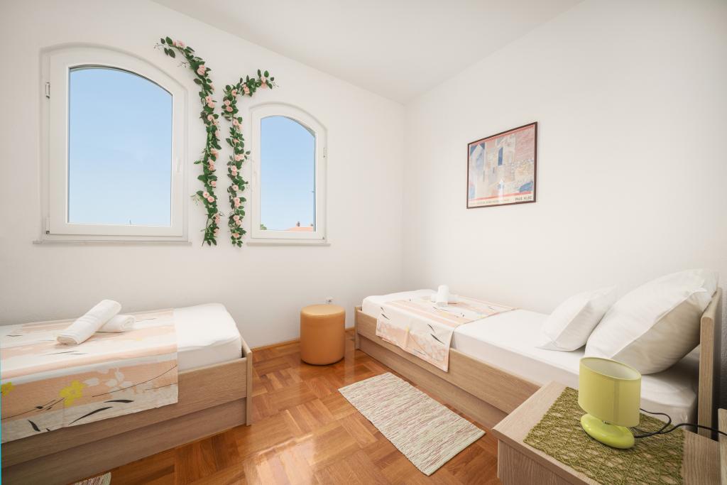Deze zeer goed onderhouden en goed uitgeruste appartementen liggen ver weg van de naburige gebouwen, midden in een grote binnenplaats, in een vredig en rustig deel van Vodice, waar het geritsel van de pijnbomen en het gezang van krekels de luidste geluiden zijn die u zult horen. INBEGREPEN IN DE PRIJS: airconditioning, draadloos internet, toeristenbelasting, SAT-TV, gebruik van barbecue met groot terras, grote parkeerplaats in de omheinde tuin. Elk appartement beschikt over een terras met tafel en stoelen en een aparte slaapkamer. Appartement A4 heeft twee aparte slaapkamers. De keukens in beide appartementen zijn identiek en rijk uitgerust. De zeer mooi ingerichte stadsstranden zijn geschikt voor kinderen en niet-zwemmers. Het stadscentrum kunt u in 15 minuten wandelen bereiken. De appartementen liggen vlakbij de hotels Imperial en Olimpya. Vergeet niet om alleen HET VERLANGEN OM TE GENIETEN VAN DE MAGIE VAN DE ZOMER mee te nemen!!