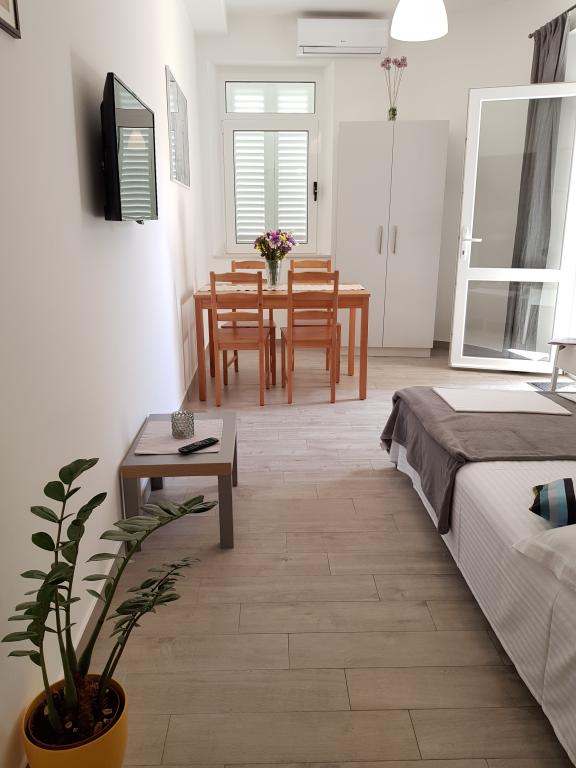 Appartement A2 2 bevindt zich op de begane grond van een gezinswoning. Het bestaat uit een kamer met een bed (160x200cm), een woonkamer met een bank (160x200cm), een keuken, een badkamer en een terras. Appartement A2 3 bevindt zich op de begane grond van een gezinswoning. Het bestaat uit een kamer met een bed (160x200cm) en een bed (90x200cm), een woonkamer met een bank (160x200cm), een keuken, een badkamer en een terras. De appartementen zijn volledig aangepast. Toegang tot het terras is gemakkelijk voor kinderwagens en fietsen. (slechts drie stappen). De straat is rustig en alleen voor voetgangers. Appartement A-10 1 (A-8 3) is gelegen op de eerste verdieping. Het bestaat uit een vierpersoonskamer, twee driepersoonskamers, twee keukens, een grote hal, drie badkamers, drie balkons en een terras bij de ingang, 40 m van het strand. De ingang is gescheiden van de voetgangersstraat. Beide appartementen hebben beveiligde parkeerplaatsen en plat internet.