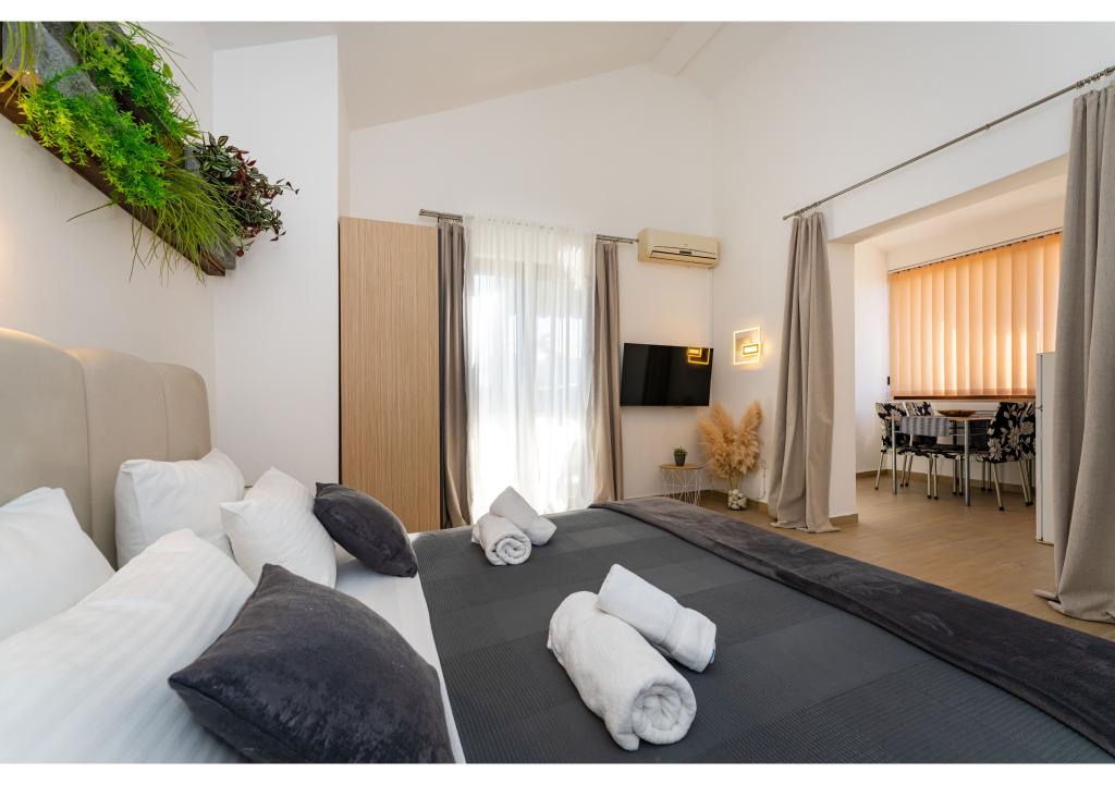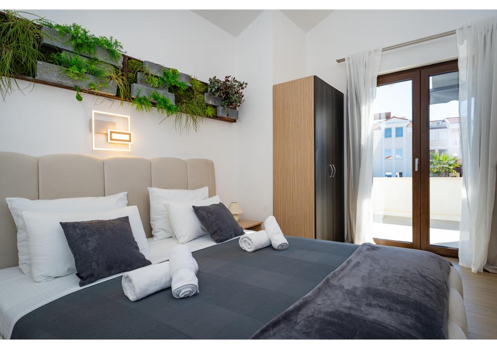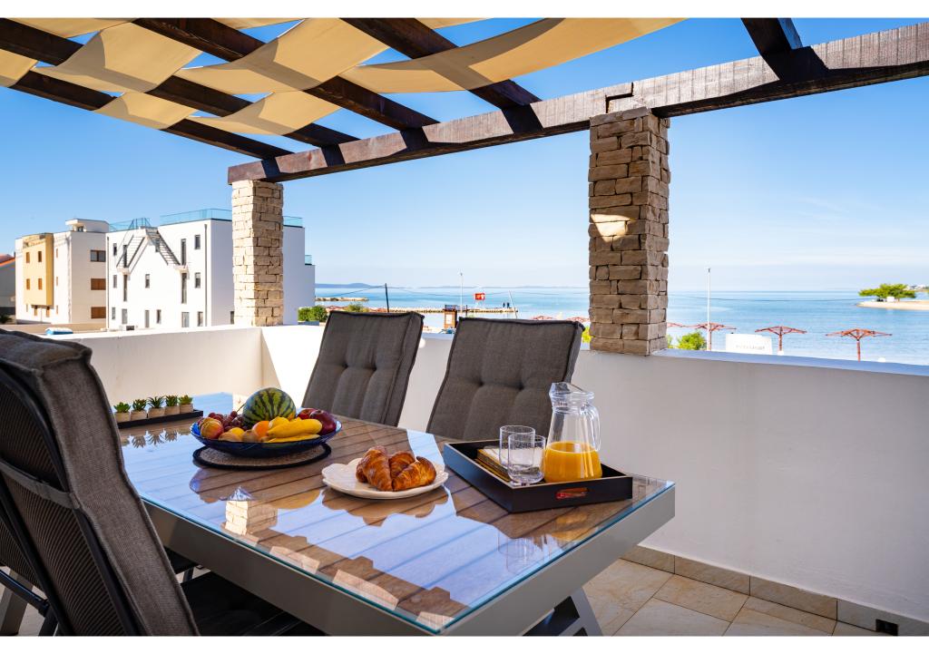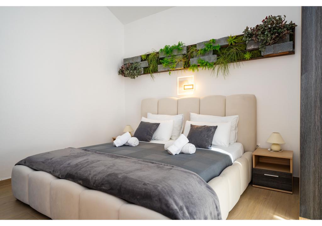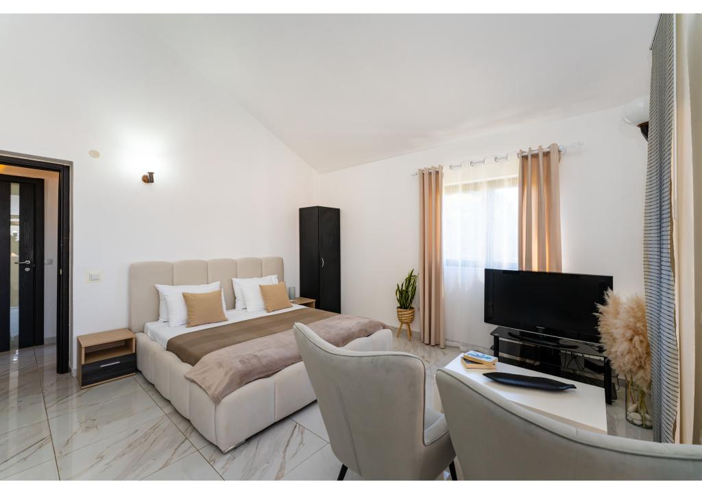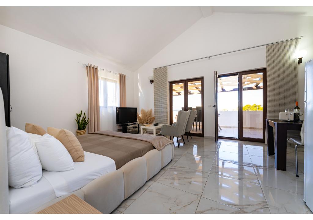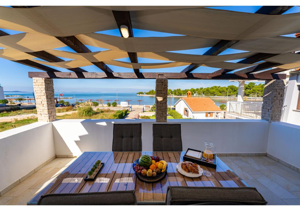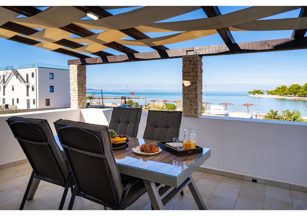 Appartementen op de eerste rij aan zee. Terras met uitzicht op zee. De baai is zanderig en ondiep. De appartementen liggen vlakbij het toeristische centrum van Zaton en zijn voorzien van airconditioning, internet, satelliet-tv, parkeergelegenheid, barbecue, etc.