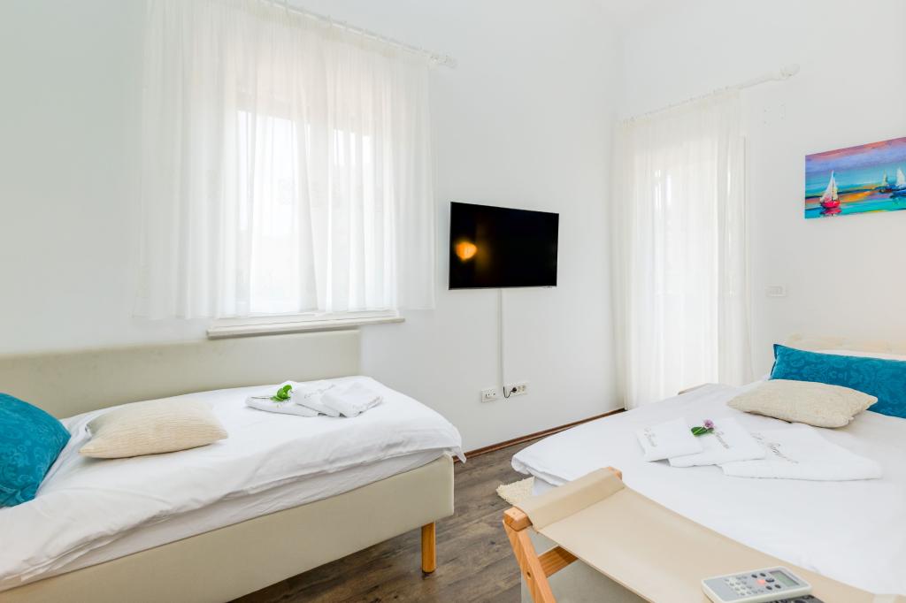 Gelegen op slechts 200 meter van de zee, biedt het een ideale gelegenheid om te ontspannen op het prachtige strand van Uhić of te genieten van het verwarmde zwembad, dat ook watermassages aanbiedt. Er zijn goed onderhouden wandelpaden in de omgeving en fietsen langs de kust van de baai is een bijzonder genot. Aan het einde van een aangename dag kunt u de avond doorbrengen met een wandeling langs de waterkant of genieten van een heerlijke maaltijd en een glas goede Krk-wijn in een van de nabijgelegen restaurants. Wij verwelkomen u graag met een welkomstdrankje. Neem contact met ons op voor een vrijblijvende offerte.