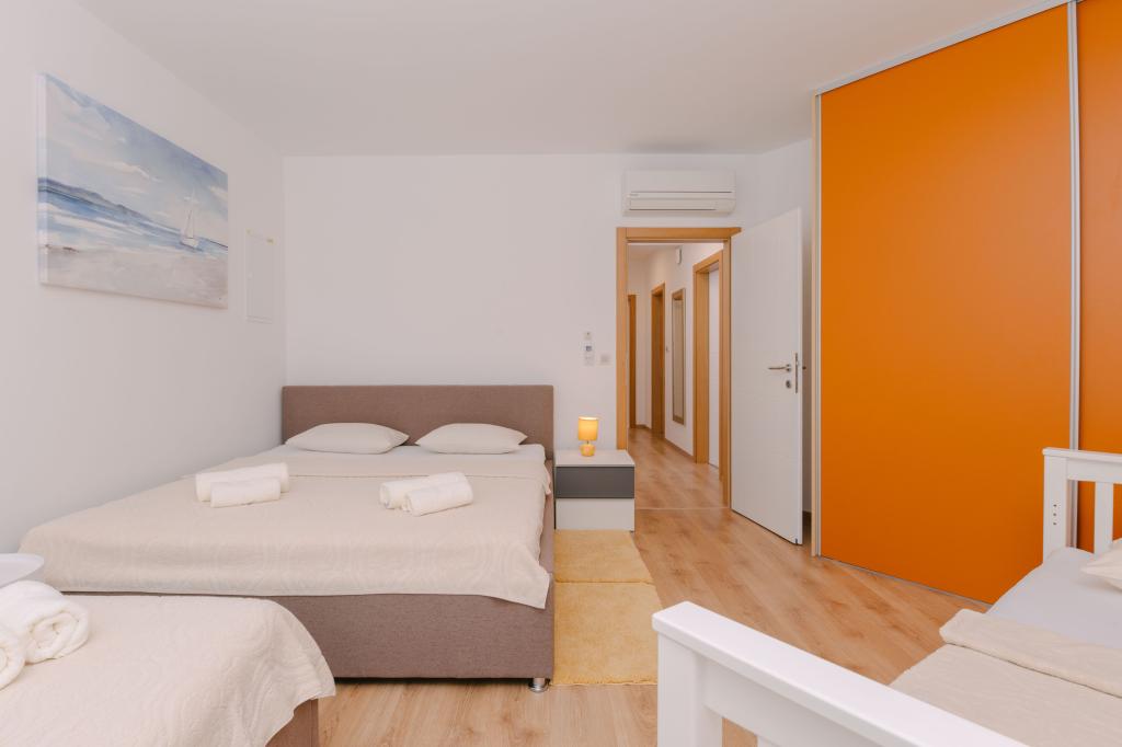 Op de bovenverdieping bevinden zich drie moderne slaapkamers, terwijl er in de kelder een gastenkamer is. Alle badkamers zijn voorzien van hoogwaardige Grohe- en Laufen-kranen, prestigieuze designkeramische tegels en elegante glazen deuren. Het huis is officieel gecategoriseerd door het Ministerie van Toerisme van de Republiek Kroatië, waardoor het comfortabel plaats biedt aan 9, zelfs 10 gasten. De open woon- en eetkamer, evenals elke slaapkamer, zijn voorzien van individuele airconditioning met een stille stand, ideaal voor een goede nachtrust. De moderne keuken, van het bekende Oostenrijkse merk DanKüchen, is volledig uitgerust met hoogwaardige apparatuur, waaronder een koelkast met ijsblokjesmachine en een waterkoeler.