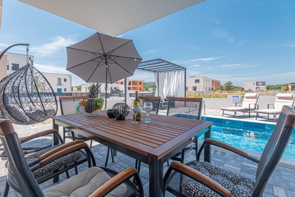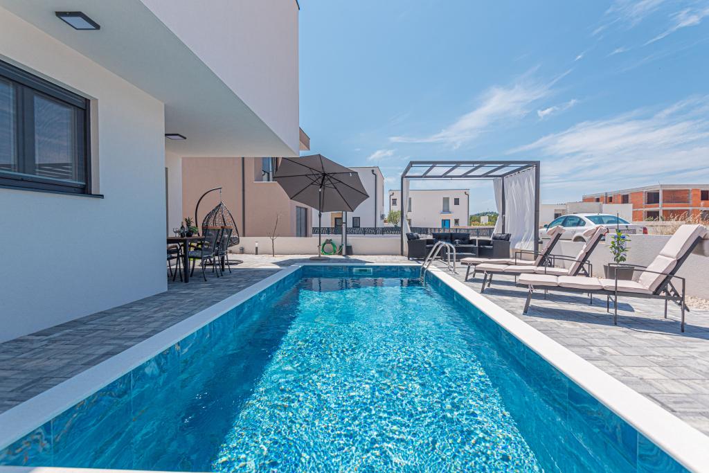 Een nieuwe, volledig ingerichte villa met zwembad in een rustige hoek van de stad Vodice, ongeveer 1 km of 15 minuten lopen van het centrum, het strand en andere voorzieningen. De villa heeft een zwembad van 7x3 m, 1,5 m diep, verwarmd, naast het zwembad zijn er ligstoelen, een tuinschommel en meubilair om uit te rusten in het tuinhuisje. De achtertuin heeft een buitengrill en een eettafel. De woning beschikt over drie kamers op de eerste verdieping, een masterbedroom met badkamer en twee kamers met badkamer op de gemeenschappelijke gang. De bedden in twee kamers hebben de afmetingen 180x200 cm, en de derde kamer heeft aparte bedden, 90x200 en 120x200. Alle kamers zijn uitgerust met televisie en airconditioning. Beddengoed en handdoeken zijn beschikbaar voor de gasten. Op de begane grond is de keuken volledig uitgerust met servies, een broodrooster, een staafmixer en een elektrische sapcentrifuge voor citrusvruchten, evenals een filterkoffiezetapparaat. De keuken is voorzien van een vaatwasser, koelkast en vriezer, oven en magnetron. De woonkamer is voorzien van een hoekbank en een televisie met internet en satellietzenders.