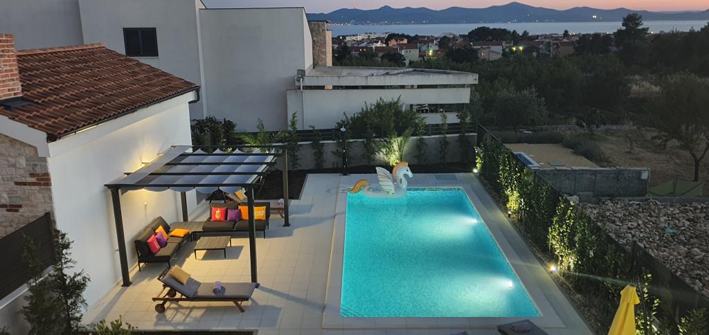 De nieuwe, zojuist voltooide Villa, modern ingericht, zal u een onvergetelijke en perfecte vakantie in Zadar bezorgen. Villa met panoramisch uitzicht op de oude stad is gelegen in Zadar op een rustige locatie, op slechts een paar minuten rijden van de oude stad waar dagelijks verschillende evenementen worden gehouden, en een aantal restaurants met een uitstekend gastronomisch aanbod, evenals een aantal historische bezienswaardigheden. De villa bestaat uit een souterrain met een fitnessruimte en een taverne, een begane grond met een woonkamer met ingerichte keuken, een toilet met wasmachine en een wellnessruimte met een jacuzzi en een massagedouche. Op de eerste verdieping bevinden zich 4 kamers waarvan er 3 een groot toilet delen, terwijl één kamer een eigen toilet en balkon heeft met prachtig uitzicht op zee en het buitenzwembad. Op de tweede verdieping is er een panoramisch uitzicht over Zadar en de zee, evenals een kamer met een spelcomputer en darts. Voor de Villa is er een prachtig groot zwembad van 9x4, evenals een terras en ligstoelen. Tijdens uw verblijf in Zadar raden wij u deze prachtige Villa zeker aan.